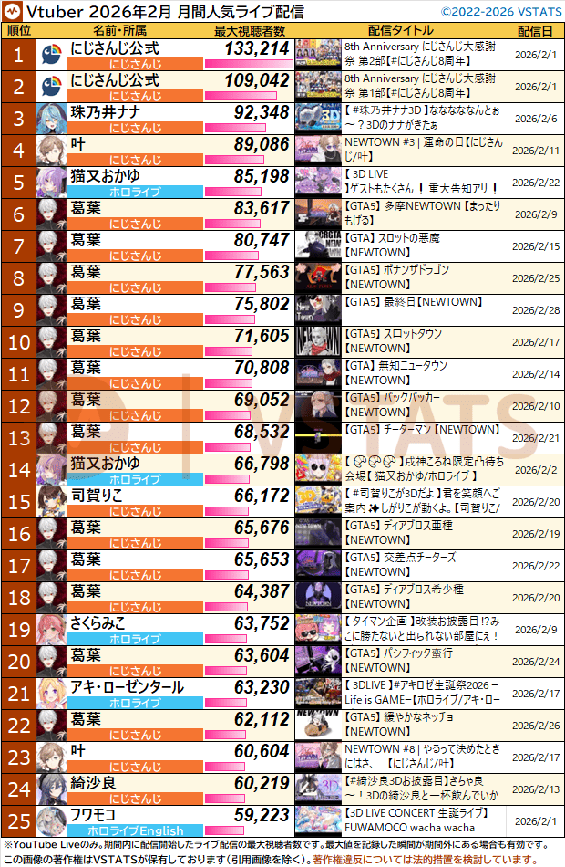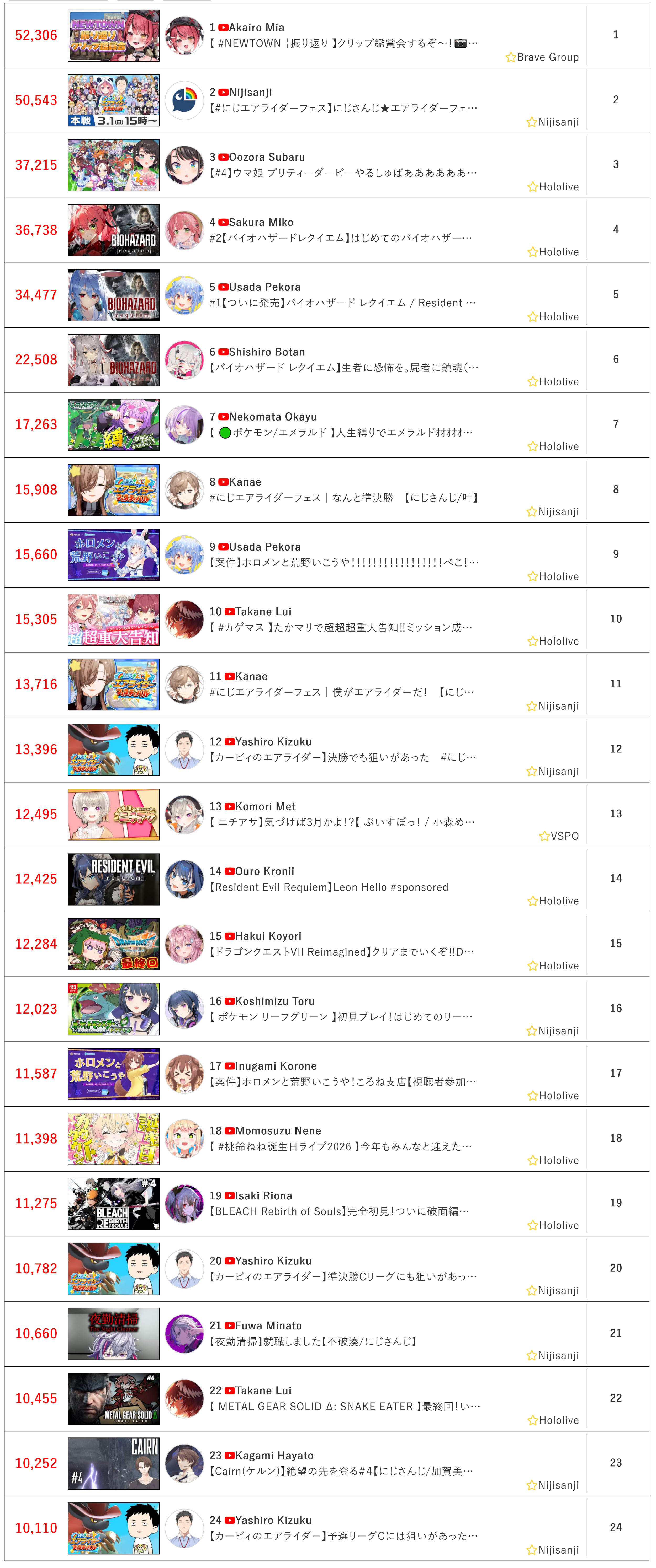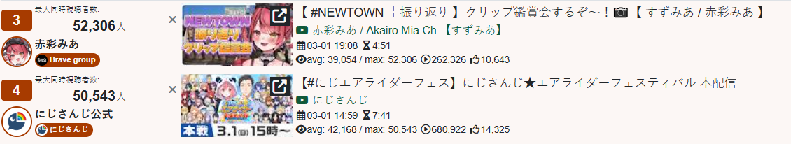 * FINAL TALLY OF THE DAY IS IN *Here it goes>52,306: Akairo Mia (Brave Group)>50,543: Nijisanji (Nijisanji)>37,215: Subaru (Hololive)>36,738: Miko (Hololive)>34,477: Pekora (Hololive)>22,508: Botan (Hololive)>17,263: Okayu (Hololive)>15,908: Kanae (Nijisanji)>15,660: Pekora (Hololive)>15,305: Lui (Hololive)>13,716: Kanae (Nijisanji)>13,396: Yashiro (Nijisanji)>12,495: Met (VSPO)>12,425: Kronii (Hololive)>12,284: Koyori (Hololive)>12,023: Toru (Nijisanji)>11,587: Korone (Hololive)>11,398: Nene (Hololive)>11,275: Riona (Hololive)>10,782: Yashiro (Nijisanji)>10,660: Fuwa (Nijisanji)>10,455: Lui (Hololive)>10,252: Kagami (Nijisanji)>10,110: Yashiro (Nijisanji)Gold for Akairo Mia (former indie now directly under Brave Group, no branch) with a NEWTOWN clip show, with Nijisanji getting silver with their Air Riders tournament and Subaru, bronze