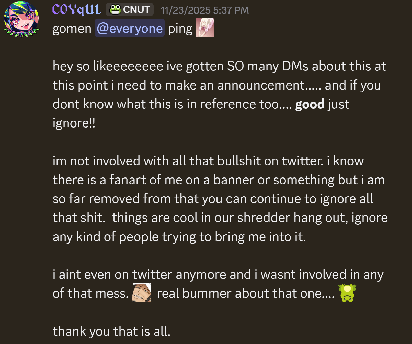>>109882479Nice attempt to connect The south Side and especially Coqui to this bitch. In addition to what >>109882505 said, she also decided to put a picture of Coqui in the banner of some Lewdtubers Twitter group she started without her knowledge or consent.