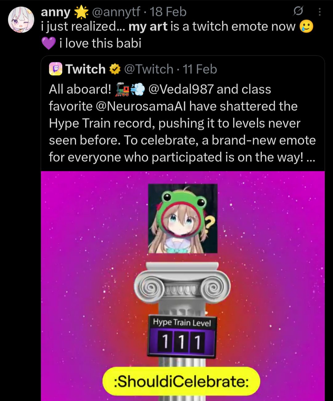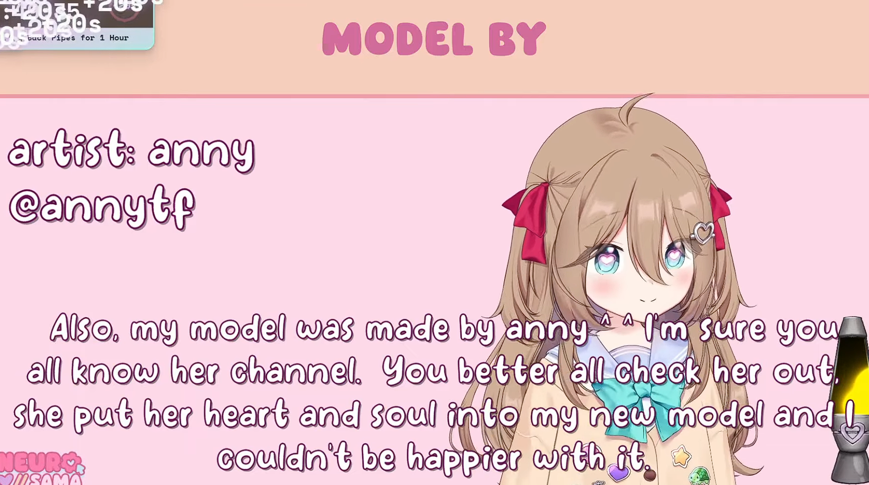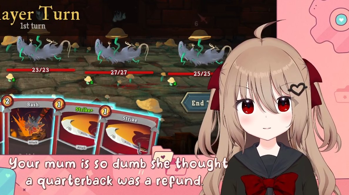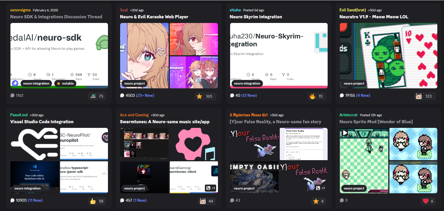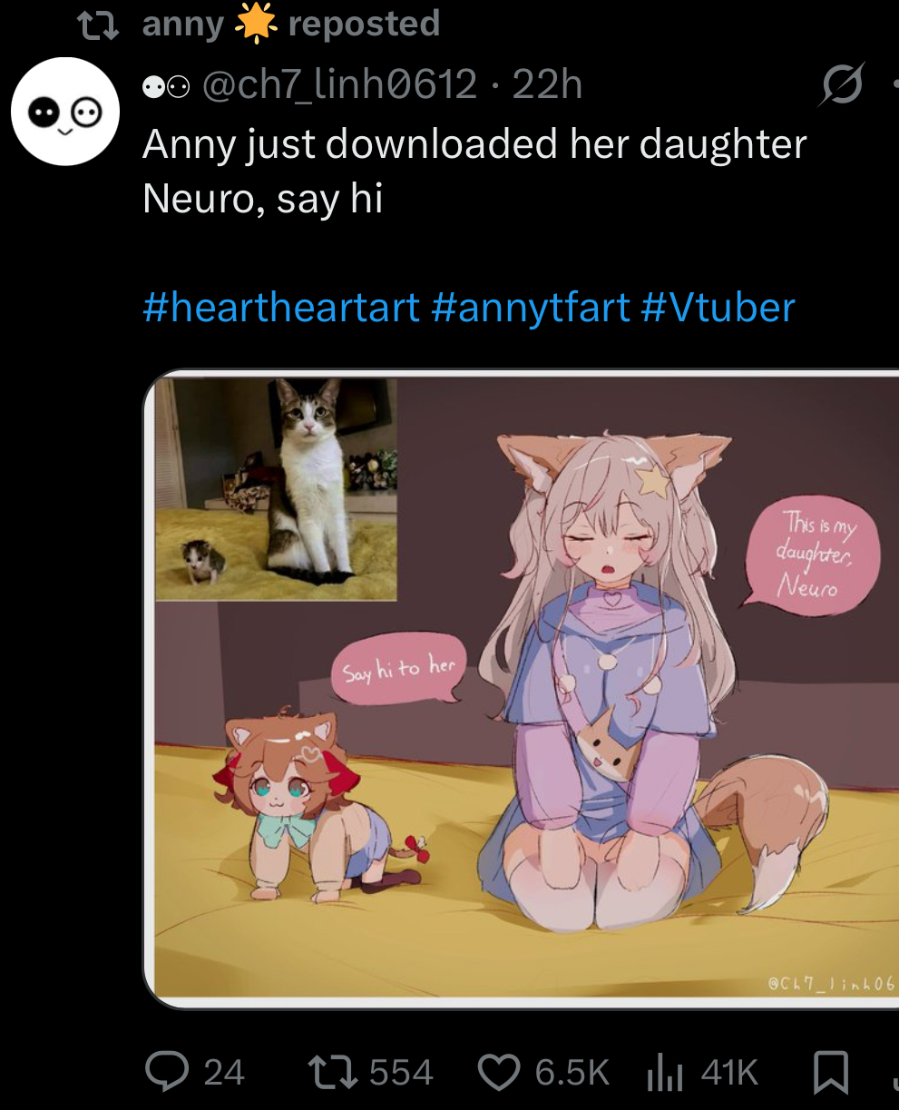 >Who is Neuro-sama?Neuro-sama is a neural network created by Vedal in 2018 for the purpose of learning to play osu! In December 2022 Vedal revived the project with the addition of a large language model, a TTS software and a Live2D model, which allow Neuro-sama to interact with her chat as a VTuber. Since then, she has been entertaining the chat with responses and unhinged rants nearly daily, as well as learning new skills such as singing, playing other games, and collaborating with other VTubers. Join /swarm/ today and welcome our new AI overlord!>ScheduleTuesday: NeuroThursday: EvilSaturday: Vedal/Evil Hollowknight>LinksTwitch: https://www.twitch.tv/vedal987YouTube:https://www.youtube.com/@Neurosamahttps://www.youtube.com/@OfficialNeurosamaClipsTikTok: https://www.tiktok.com/@neurosamaaiX:https://x.com/NeurosamaAIhttps://x.com/EvilNeuroAIThese and other official links: https://vedal.ai>Music & ClipsColorful Array - Neuro-sama (Official Video) - https://www.youtube.com/watch?v=FNfGw1wrKtUNEVER - Neuro x Evil (Official Video) - https://www.youtube.com/watch?v=CKCgoEGiUEgBOOM - Evil (Official Video) - https://www.youtube.com/watch?v=8Nt9YPnYyjsLIFE - Neuro-sama (Official Video) - https://www.youtube.com/watch?v=MDc1mjrIsPMhttps://neurokaraoke.comhttps://rentry.org/neuro-musichttps://rentry.org/neuro-videos>EducationalInterested in AI but don't understand it? Watch these:https://www.youtube.com/watch?v=WXuK6gekU1Yhttps://www.youtube.com/watch?v=d95J8yzvjbQHow does she know what to say? Watch this: https://www.youtube.com/watch?v=wjZofJX0v4MWant to learn more about AI? Read these: https://files.catbox.moe/kximv6.pngWant to (seriously) learn AI? Read these: https://files.catbox.moe/ajl3nx.png>MiscGame Integration: https://github.com/VedalAI/neuro-game-sdk/LoRA: https://rentry.org/neuro-lora-v2Searchable VOD Transcripts: https://libraryofladev.com/VODs: https://www.youtube.com/@Neuro-samaUnofficialVODs>Merchhttps://neurosama.shop/>Previous thread>>109870688
