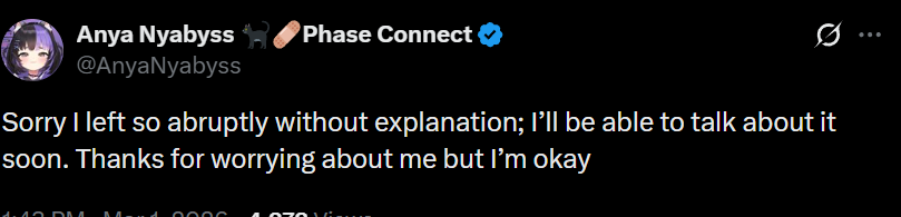 ▼ Phase Connect LinksOfficial Website: https://phase-connect.comOfficial Schedule: https://schedule.phase-connect.comOfficial Twitter: https://x.com/PhaseConnect | https://x.com/PhaseConnectJPOfficial Character References: https://rentry.org/pcgreferencesOfficial Twitch Archive Channels: https://rentry.org/pcgtwitcharchiveUnofficial Phase Connect Archives: https://rentry.org/pcgunofficialarchive––––––––––––––––––––––––––––––––––◆【Lia】https://x.com/rinkouashelia | https://youtube.com/RinkouAshelia | https://twitch.tv/asheliarinkou◆【Utatane Nasa】転寝ナサ (JP) https://x.com/UtataneNasa | https://youtube.com/UtataneNasa | https://twitch.tv/utatanenasa◆【Hakushika Iori】白鹿いおり (JP + EN) https://x.com/hakushikaiori | https://youtube.com/HakushikaIori | https://twitch.tv/iorihakushika◆【Fujikura Uruka】https://x.com/fujikurauruka | https://youtube.com/FujikuraUruka | https://twitch.tv/fujikurauruka◆【Shisui Michiru】紫翠みちる (JP) https://x.com/shisuimichiru | https://youtube.com/ShisuiMichiru | https://twitch.tv/michiru_shisui◆【Tenma Maemi】https://x.com/tenmamaemi | https://youtube.com/TenmaMaemi | https://twitch.tv/tenma◆【Pipkin Pippa】https://x.com/pipkinpippa | https://youtube.com/PipkinPippa | https://twitch.tv/pippa––––––––––––––––––––––––––––––––––◆【Kaneko Lumi】https://x.com/kaneko_lumi | https://youtube.com/KanekoLumi | https://twitch.tv/kanekolumi◆【Fuura Yuri】[Terminated] https://x.com/AmarisYuri | Archive: https://youtube.com/@TheNationalFuuraYuriArchive◆【Dizzy Dokuro】https://x.com/dizzydokuro | https://youtube.com/@dizzydokuro | https://twitch.tv/dizzydokuro◆【Jelly Hoshiumi】https://x.com/jellyhoshiumi | https://youtube.com/@jellyhoshiumi | https://twitch.tv/jellyhoshiumi◆【Ember Amane】https://x.com/emberamane | https://youtube.com/@EmberAmane | https://twitch.tv/emberamane◆【Clio Aite】https://x.com/ClioAite | https://youtube.com/@ClioAite | https://twitch.tv/clioaite◆【MariMari_en】https://x.com/MARIMARI_EN | https://youtube.com/@MARIMARI_EN | https://twitch.tv/marimari_en◆【Eepy Sleepy】https://x.com/EepySleepyCh | https://youtube.com/@EepySleepyCh | https://twitch.tv/EepySleepy––––––––––––––––––––––––––––––––––◆【Remilia Nephys】https://x.com/Remilia_Nephys | https://youtube.com/RemiliaNephys | https://twitch.tv/remilianephys◆【Chisaka Airi】https://x.com/ChisakaAiri | https://youtube.com/ChisakaAiri | https://twitch.tv/chisakaairi◆【Amanogawa Shiina】https://x.com/AmanogawaShiina | https://youtube.com/AmanogawaShiina | https://twitch.tv/amanogawashiina◆【Himemiya Rie】https://x.com/HimemiyaRie | https://youtube.com/HimemiyaRie | https://twitch.tv/himemiyarie◆【Erina Makina】https://x.com/ErinaMakina | https://youtube.com/ErinaMakina | https://twitch.tv/erinamakina◆【Komachi Panko】https://x.com/komachipanko | https://youtube.com/KomachiPanko | https://twitch.tv/komachipanko––––––––––––––––––––––––––––––––––◆【Runie Ruse】https://x.com/RunieRuse | https://youtube.com/@RunieRuse | https://twitch.tv/RunieRuse◆【Eimi Isami】https://x.com/eimiisami | https://youtube.com/@eimiisami | https://twitch.tv/eimiisami◆【Muu Muyu】https://x.com/Muu_Muyu | https://youtube.com/@MuuMuyu | https://twitch.tv/MuuMuyu◆【Hikanari Hina】https://x.com/HikanariHina | https://youtube.com/@HikanariHina | https://twitch.tv/HikanariHina◆【Saya Sairroxs】[Phase Citizen] https://x.com/sayasairroxs | https://youtube.com/@sayasairroxs | https://twitch.tv/sayasairroxs––––––––––––––––––––––––––––––––––◆【Kannagi Loki】巫ロキ (JP) https://x.com/kannagiloki | https://youtube.com/@kannagiloki ◆【Kokoromo Memory】[Phase Citizen] https://x.com/kokoromomemory | https://youtube.com/@kokoromomemory_ | https://twitch.tv/kokoromomemory◆【Gram Pico】倉夢ぴこ (JP) https://x.com/grampico_ | https://youtube.com/@grampico | https://twitch.tv/grampico◆【Ayase Yuu】絢世ユウ (JP) https://x.com/ayaseyuuu | https://youtube.com/@ayaseyuu | https://twitch.tv/ayaseyuu_◆【Kaminari Clara】[Graduated] https://x.com/kaminariclara_ | https://youtube.com/@kaminariclara | https://twitch.tv/kaminariclara––––––––––––––––––––––––––––––––––◆【Malice Evermore】https://x.com/MaliceEvermore | https://youtube.com/@maliceevermore | https://twitch.tv/maliceevermore◆【Nitya Nil】https://x.com/Nitya_Nil | https://youtube.com/@Nitya_Nil | https://twitch.tv/nitya_nil◆【Wilhelmina Frost】https://x.com/wilhelminafr0st | https://youtube.com/@wilhelminafrost | https://twitch.tv/wilhelminafrost◆【Bibi Biscuit】https://x.com/BibiBiscuitCh | https://youtube.com/@bibibiscuitch | https://twitch.tv/bibibiscuitch◆【Anya Nyabyss】https://x.com/AnyaNyabyss | https://youtube.com/@AnyaNyabyss | https://twitch.tv/anyanyabyss◆【Sinon Sinfonia】https://x.com/SinonSinfonia | https://youtube.com/@SinonSinfonia | https://twitch.tv/sinonsinfoniaPrevious Thread: >>109881002