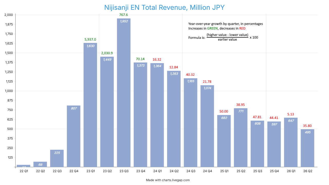 >>109894036>Last financial report they made less money than when it was just Lazulight and Obsydia, only six girlsThat's not entirely true. It's one of those "seems like it's true but it's actually false" things.The only quarter in which they had only those six girls and nobody else was Q1 of FY 2022 (May-July 2021) and their revenue for that quarter was 27m JPY. You could argue that FY22-Q2 was the first "six girls" quarter, since it was the first to have all six of them for all three months of the quarter, and they got 68m JPY that quarter; but Ethyria debuted at the tail end of that quarter.Their most recent report put them at 495m JPY for FY26-Q2. Their last quarter with less than that was FY22-Q3, in which they made 225m JPY; this was also the quarter in which Luxiem debuted (about halfway through the quarter)The FY26-Q3 report is coming out next Wednesday at around 1530 JST.