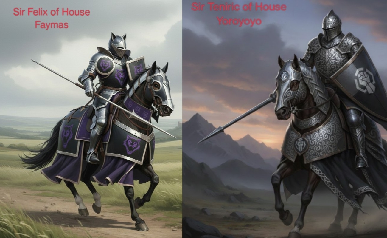 For the Championship of Bracket 1; Sir Teniric and Sir Felix shall joust. They represent their liege Ladies Yoroyoyo and Jean Faymas