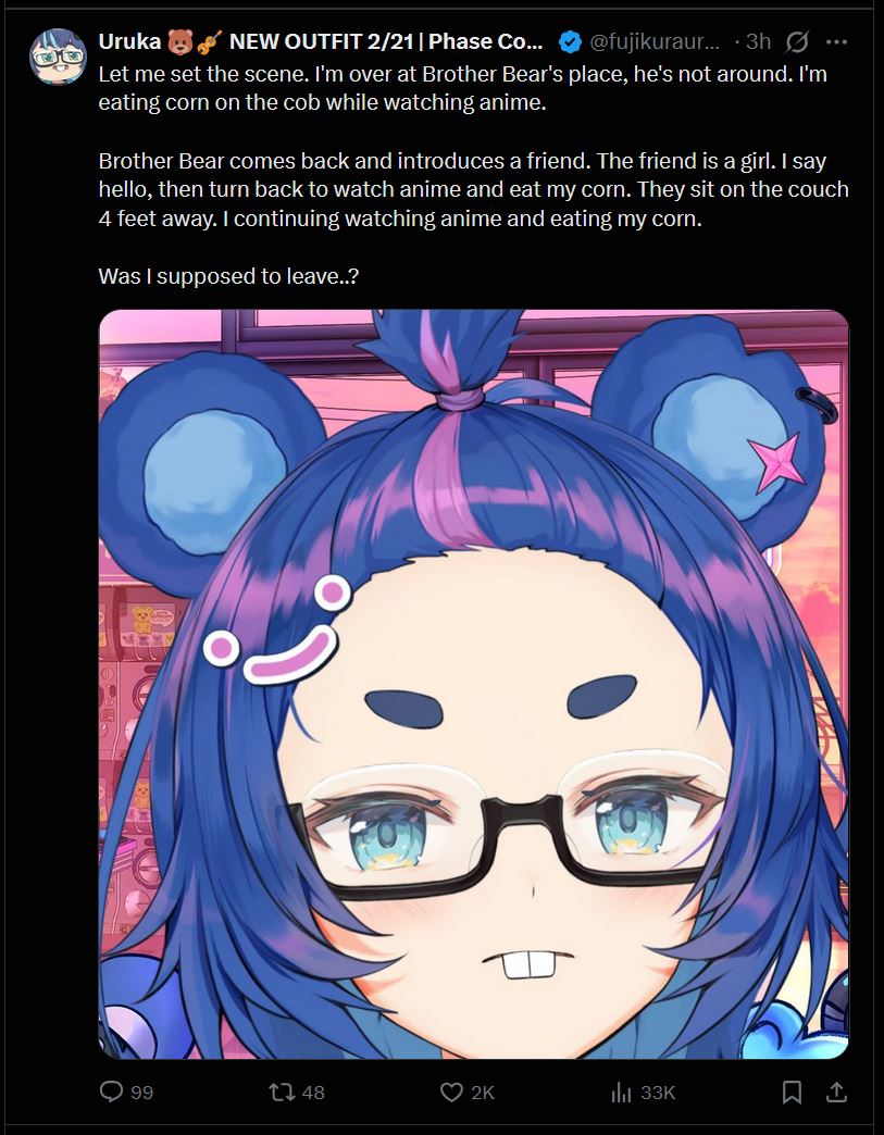 >>109901112This was literally earlier today, retard.https://x.com/fujikurauruka/status/2028060236054155414>>109902035>lol woke lol Mexican lololThis is literally just Lia's humor. You'd know that if you actually watched her streams.>>109902084This.