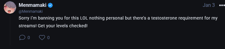 Menace said that any man who gossips about vtubers like a woman should have bottom surgery forced on them, I think any man who complains about how an anime woman makes him cum should have his balls inverted into his anus.