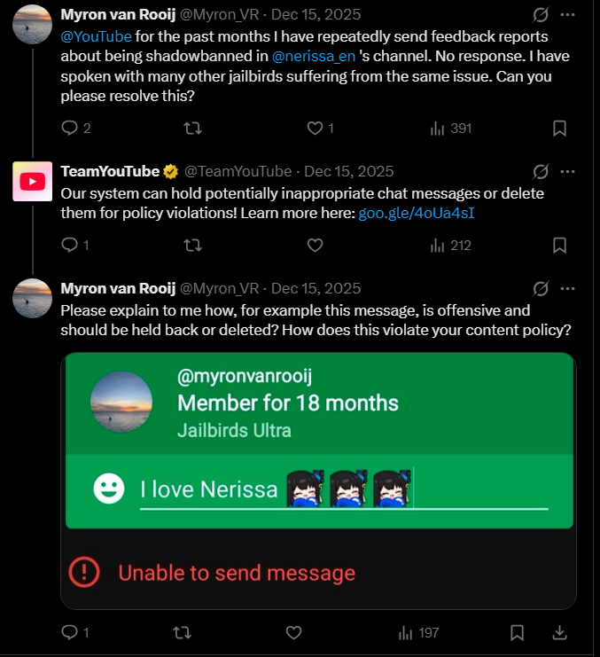 >>109920178Youtube has thing called "Hide user from channel". It's pretty diabolical because you'd assume it's on YouTubes end but nope it's a scapegoat for content creators. If he was set to hidden from channel by a mod or Nerissa herself his comments and chats will appear on his end but be unseen by everyone else, Member streaks and super chats will be unsendable.It's more likely that a chatter that went against the grain was hidden from the channel then the platform itself shadowbanning a user that doesn't even upload content.