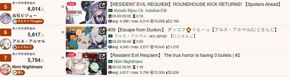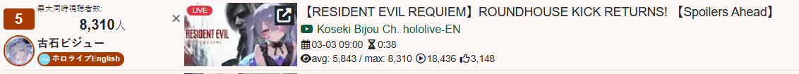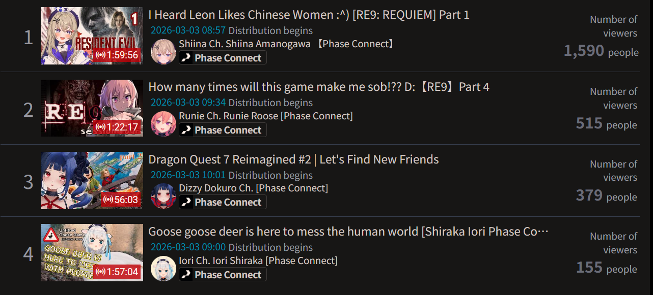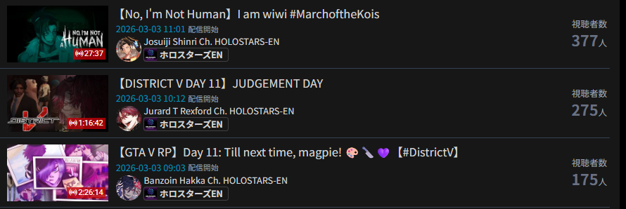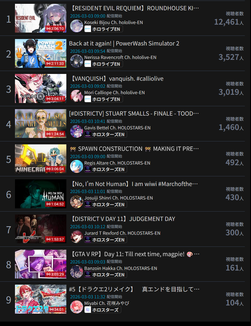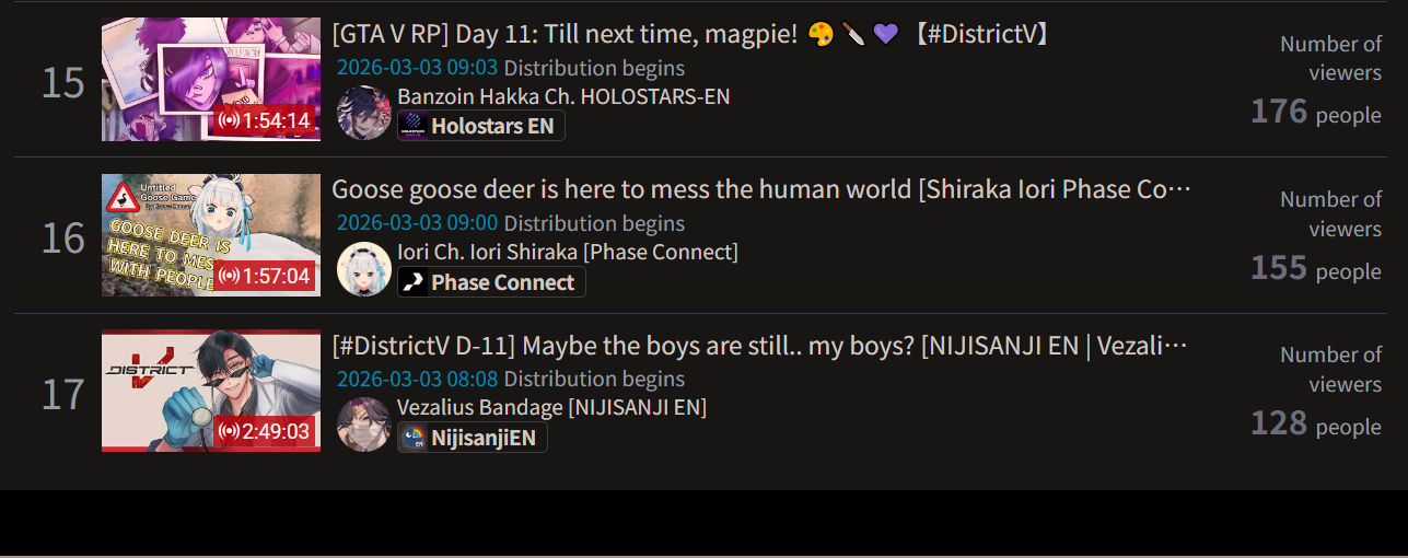 Monsters and Men and Ridin' on Dreams make the list in their first week. Koi does not qualify for the list in its first week. Gold Unbalance (Mori Calliope feat. Nakajima Kento) has been removed from the list, likely for copyright reasons. Any of the new album tracks from Mori Calliope, Takanashi Kiara, and Ninomae Ina'nis that may have made the list this week were not added by the uploader.