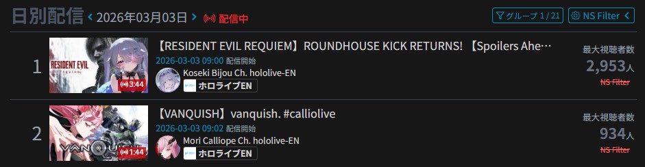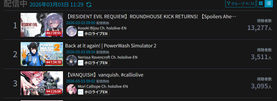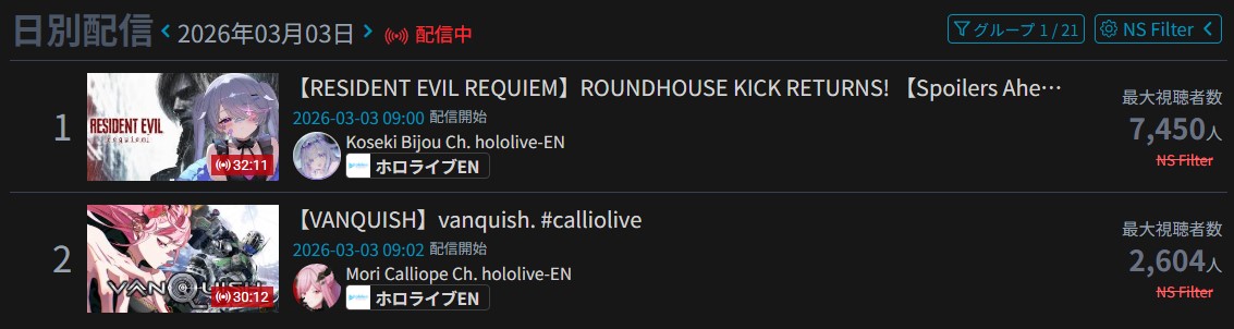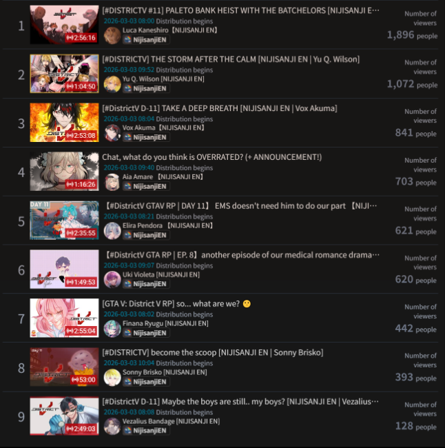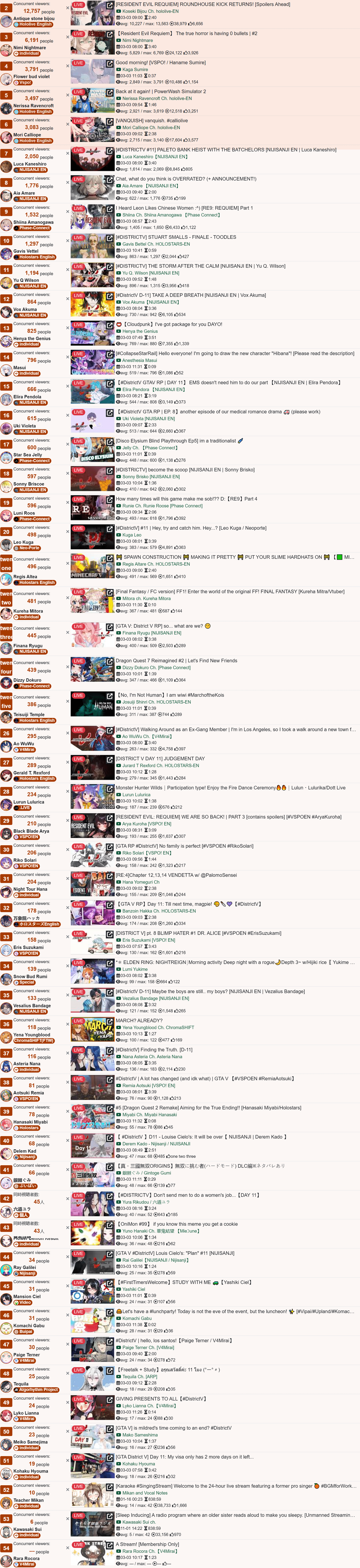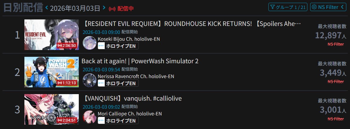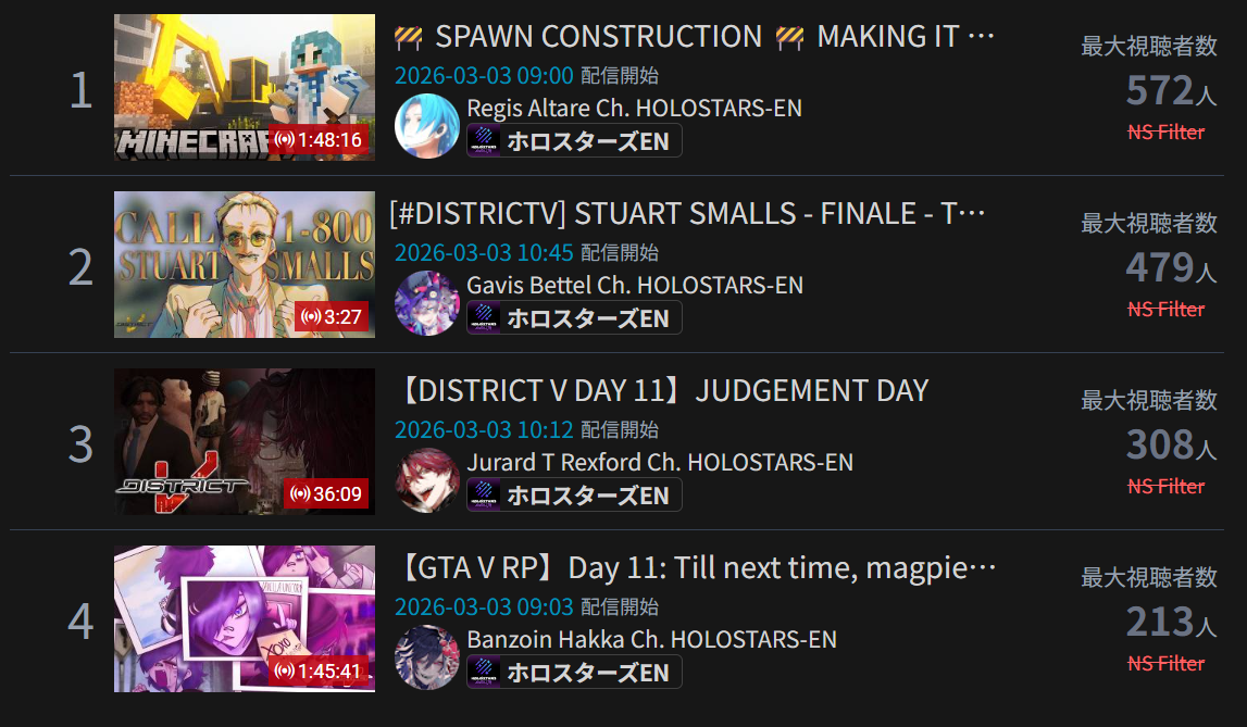 Monsters and Men and Ridin' on Dreams make the list in their first week. Koi does not qualify for the list in its first week. Gold Unbalance (Mori Calliope feat. Nakajima Kento) has been removed from the list, likely for copyright reasons. Any of the new album tracks from Mori Calliope, Takanashi Kiara, and Ninomae Ina'nis that may have made the list this week were not added by the uploader.