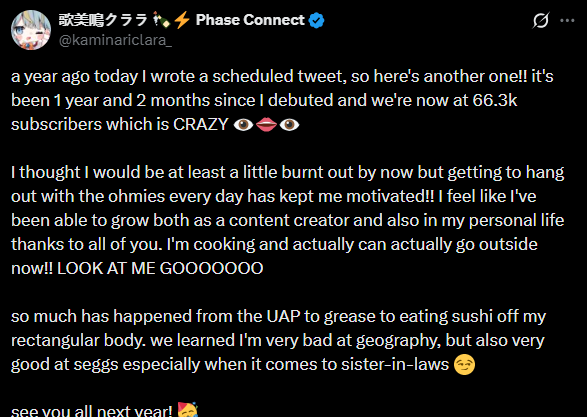 ▼ Phase Connect LinksOfficial Website: https://phase-connect.comOfficial Schedule: https://schedule.phase-connect.comOfficial Twitter: https://x.com/PhaseConnect | https://x.com/PhaseConnectJPOfficial Character References: https://rentry.org/pcgreferencesOfficial Twitch Archive Channels: https://rentry.org/pcgtwitcharchiveUnofficial Phase Connect Archives: https://rentry.org/pcgunofficialarchive––––––––––––––––––––––––––––––––––◆【Lia】https://x.com/rinkouashelia | https://youtube.com/RinkouAshelia | https://twitch.tv/asheliarinkou◆【Utatane Nasa】転寝ナサ (JP) https://x.com/UtataneNasa | https://youtube.com/UtataneNasa | https://twitch.tv/utatanenasa◆【Hakushika Iori】白鹿いおり (JP + EN) https://x.com/hakushikaiori | https://youtube.com/HakushikaIori | https://twitch.tv/iorihakushika◆【Fujikura Uruka】https://x.com/fujikurauruka | https://youtube.com/FujikuraUruka | https://twitch.tv/fujikurauruka◆【Shisui Michiru】紫翠みちる (JP) https://x.com/shisuimichiru | https://youtube.com/ShisuiMichiru | https://twitch.tv/michiru_shisui◆【Tenma Maemi】https://x.com/tenmamaemi | https://youtube.com/TenmaMaemi | https://twitch.tv/tenma◆【Pipkin Pippa】https://x.com/pipkinpippa | https://youtube.com/PipkinPippa | https://twitch.tv/pippa––––––––––––––––––––––––––––––––––◆【Kaneko Lumi】https://x.com/kaneko_lumi | https://youtube.com/KanekoLumi | https://twitch.tv/kanekolumi◆【Fuura Yuri】[Terminated] https://x.com/AmarisYuri | Archive: https://youtube.com/@TheNationalFuuraYuriArchive◆【Dizzy Dokuro】https://x.com/dizzydokuro | https://youtube.com/@dizzydokuro | https://twitch.tv/dizzydokuro◆【Jelly Hoshiumi】https://x.com/jellyhoshiumi | https://youtube.com/@jellyhoshiumi | https://twitch.tv/jellyhoshiumi◆【Ember Amane】https://x.com/emberamane | https://youtube.com/@EmberAmane | https://twitch.tv/emberamane◆【Clio Aite】https://x.com/ClioAite | https://youtube.com/@ClioAite | https://twitch.tv/clioaite◆【MariMari_en】https://x.com/MARIMARI_EN | https://youtube.com/@MARIMARI_EN | https://twitch.tv/marimari_en◆【Eepy Sleepy】https://x.com/EepySleepyCh | https://youtube.com/@EepySleepyCh | https://twitch.tv/EepySleepy––––––––––––––––––––––––––––––––––◆【Remilia Nephys】https://x.com/Remilia_Nephys | https://youtube.com/RemiliaNephys | https://twitch.tv/remilianephys◆【Chisaka Airi】https://x.com/ChisakaAiri | https://youtube.com/ChisakaAiri | https://twitch.tv/chisakaairi◆【Amanogawa Shiina】https://x.com/AmanogawaShiina | https://youtube.com/AmanogawaShiina | https://twitch.tv/amanogawashiina◆【Himemiya Rie】https://x.com/HimemiyaRie | https://youtube.com/HimemiyaRie | https://twitch.tv/himemiyarie◆【Erina Makina】https://x.com/ErinaMakina | https://youtube.com/ErinaMakina | https://twitch.tv/erinamakina◆【Komachi Panko】https://x.com/komachipanko | https://youtube.com/KomachiPanko | https://twitch.tv/komachipanko––––––––––––––––––––––––––––––––––◆【Runie Ruse】https://x.com/RunieRuse | https://youtube.com/@RunieRuse | https://twitch.tv/RunieRuse◆【Eimi Isami】https://x.com/eimiisami | https://youtube.com/@eimiisami | https://twitch.tv/eimiisami◆【Muu Muyu】https://x.com/Muu_Muyu | https://youtube.com/@MuuMuyu | https://twitch.tv/MuuMuyu◆【Hikanari Hina】https://x.com/HikanariHina | https://youtube.com/@HikanariHina | https://twitch.tv/HikanariHina◆【Saya Sairroxs】[Phase Citizen] https://x.com/sayasairroxs | https://youtube.com/@sayasairroxs | https://twitch.tv/sayasairroxs––––––––––––––––––––––––––––––––––◆【Kannagi Loki】巫ロキ (JP) https://x.com/kannagiloki | https://youtube.com/@kannagiloki ◆【Kokoromo Memory】[Phase Citizen] https://x.com/kokoromomemory | https://youtube.com/@kokoromomemory_ | https://twitch.tv/kokoromomemory◆【Gram Pico】倉夢ぴこ (JP) https://x.com/grampico_ | https://youtube.com/@grampico | https://twitch.tv/grampico◆【Ayase Yuu】絢世ユウ (JP) https://x.com/ayaseyuuu | https://youtube.com/@ayaseyuu | https://twitch.tv/ayaseyuu_◆【Kaminari Clara】[Graduated] https://x.com/kaminariclara_ | https://youtube.com/@kaminariclara | https://twitch.tv/kaminariclara––––––––––––––––––––––––––––––––––◆【Malice Evermore】https://x.com/MaliceEvermore | https://youtube.com/@maliceevermore | https://twitch.tv/maliceevermore◆【Nitya Nil】https://x.com/Nitya_Nil | https://youtube.com/@Nitya_Nil | https://twitch.tv/nitya_nil◆【Wilhelmina Frost】https://x.com/wilhelminafr0st | https://youtube.com/@wilhelminafrost | https://twitch.tv/wilhelminafrost◆【Bibi Biscuit】https://x.com/BibiBiscuitCh | https://youtube.com/@bibibiscuitch | https://twitch.tv/bibibiscuitch◆【Anya Nyabyss】https://x.com/AnyaNyabyss | https://youtube.com/@AnyaNyabyss | https://twitch.tv/anyanyabyss◆【Sinon Sinfonia】https://x.com/SinonSinfonia | https://youtube.com/@SinonSinfonia | https://twitch.tv/sinonsinfoniaPrevious Thread: >>109921239