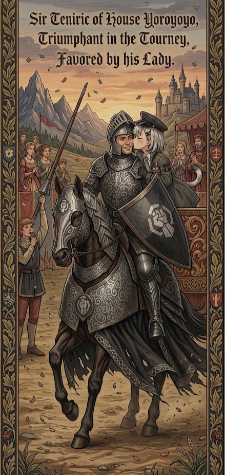 Sir Teniric was bestowed a kiss by his liege Lady, and a new castle. It is said that he went on to train a new Knight regiment for his Iron Lady's honor guard.