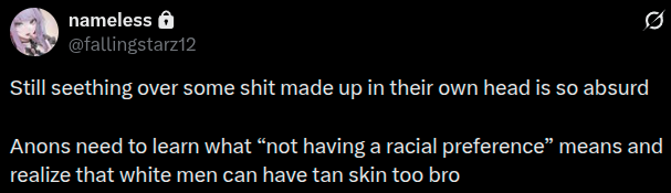 >>109940608Well tanned skin for white people signals an outgoing personality or at least them having a job where they touch grass regularly Very understandable why she'd gravitate towards that