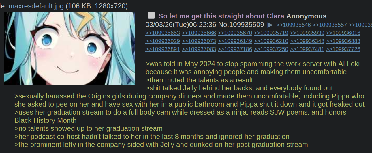 >Clara's account sends out a scheduled tweet>Phase connect management instantly locks down her twitter right afterwardsSomething is fishy as fuck with the way this went down but I can't prove anything.