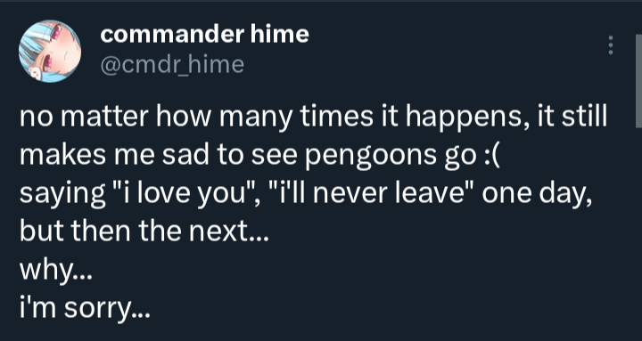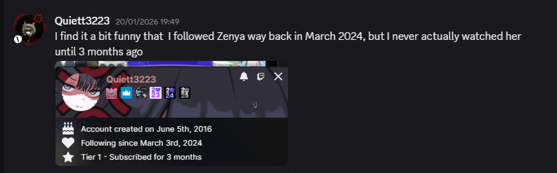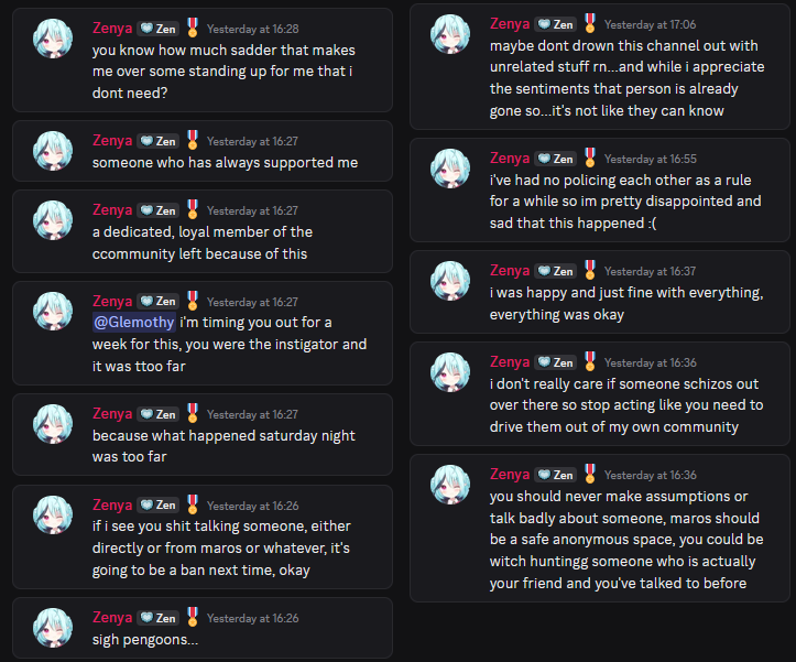 >>109966283there is nearly no overlap between discord pengoons and /tingles/ pengoons. this thread already talked about that maro and no one there cared until a few days laterthe guy was still active in her chats and socials days after the maro clearly he was okay with zenya's response, he only left the moment people started shitting on the maro in the discord. if i was zenya i would have crashed out harder. i can accept people leaving because they just get bored or tired of me, but what happened is something i didn't even do. i'd be so mad at everyone for being stupid. both her fans and the guy who leftjust like other vtubers like pillow with her recent drama involving discord retards, they should just close their servers. nene doesn't have one and she's doing great. nothing positive ever comes out of it except easier movie watchalongs