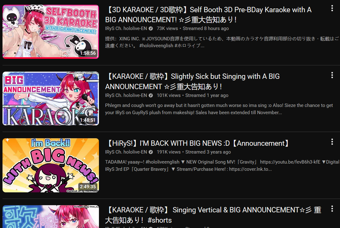 >Self Booth KaraokeRyS and 3D live announcement! https://www.youtube.com/watch?v=31LwFVCrMxA>HoloEN original Christmas songhttps://www.youtube.com/watch?v=BB2oXyYJn1M>Last Christmas collab coverhttps://www.youtube.com/watch?v=I5oAT3lBYLU>STREAM ESCALATE!https://www.youtube.com/watch?v=i2sw2i6_XDkhttps://cover.lnk.to/ZvzJDV>Stream Waiting for Me!https://www.youtube.com/watch?v=reZ1VGaoerc>Stream YaBAI!https://cover.lnk.to/39qmMB>STREAM STAY BLUE!https://www.youtube.com/watch?v=CYsxFfqtFjk >MerchRyS>Christmas Merchhttps://shop.hololivepro.com/en/products/hololiveen_happywinterholidays>American only stuffshttps://shop.hololivepro.com/en/products/hololiveen_usedition>Coom and Goon keycaps and IRyS hornshttps://hyperx.com/collections/hololive-english?utm_source=collections&utm_medium=social&utm_campaign=irys>Line stickershttps://store.line.me/stickershop/product/30223189/en>Easter Stuffshttps://shop.hololivepro.com/en/products/hololiveen_springparty>Promise Mini serieshttps://shop.hololivepro.com/en/products/holomini_vocal_promise>ENReco https://shop.hololivepro.com/en/products/hololiveen_enigmaticrecollection>Fanhttps://shop.hololivepro.com/en/products/holokatsu_bigfan_brightoutfitver>Clear folderhttps://shop.hololivepro.com/en/products/hololiveen_clearfolder?variant=45047048077532>Starter Merchhttps://shop.hololivepro.com/en/products/hololiveenstartergoods_minitape?variant=44512935641308>2024 Valentines merchhttps://shop.hololivepro.com/en/products/hololiveen_valentine2024?variant=44476441952476>2.0 Plushiehttps://shop.hololivepro.com/en/products/hololivefriends_irys>Acrylics https://shop.hololivepro.com/en/products/hololive_holonatsuparadisemerch_vol2_acrylicstandhttps://shop.hololivepro.com/en/products/hololivesummer2023_acrylicstand_ssp_rerunhttps://shop.hololivepro.com/en/products/hololiveen_3dacrylicstand?variant=44100998725852https://shop.hololivepro.com/en/products/hololivecloset_irys_1https://shop.hololivepro.com/en/products/hololiveen_nyacrylicstand?variant=43727412986076>Voicepackshttps://shop.hololivepro.com/en/collections/irys?filter.v.m.custom.product_type=%E3%83%9C%E3%82%A4%E3%82%B9&sort_by=created-descending>OMOCAT merchhttps://www.omocat-shop.com/collections/omocat-x-hololive-en>Archives (Songs, Clips, Spaces, Misc.)https://mega.nz/folder/91EUXBqT#uuMZYZmL5cUbXZcDGMCwig (Karaoke updated until the end of 2024)https://mega.nz/folder/PJljFaDC#bERcB4FtvuLJpahT2AFb5Q (Ancient and dead)https://rentry.org/irysoundbits>Originalshttps://www.youtube.com/playlist?list=PLpBqtLy3mHw07nf_D8u-g6a3_MdLWVdIc>Moment of my life Remixhttps://www.youtube.com/watch?v=hVyH8POaBQMhttps://mora.jp/package/43000066/CVRD-487H/?fmid=TOPNEWRL01>Quarter Braveryhttps://youtube.com/playlist?list=OLAK5uy_nwlYvw84zCT0GqWr1pVku3bscruaiGlXA>Journeyhttps://youtube.com/playlist?list=OLAK5uy_lRuVh4hpNnwPG3S_nbwjtT9eabeEFbL5s&si=1LfM2fJKbaUdy6ZJ>Covers and Collab songshttps://www.youtube.com/playlist?list=PLpBqtLy3mHw2Wlox1cPU2-WGM5VmMYR8mhttps://www.youtube.com/watch?v=9qkkPOD85YEhttps://www.youtube.com/watch?v=ffRfzZxyMiMhttps://www.youtube.com/watch?v=u5ice9Ud8Rkhttps://www.youtube.com/watch?v=CHS1N3TiL-Ihttps://www.youtube.com/watch?v=IjKnRjDa5I0https://www.youtube.com/watch?v=3jd50SqqKxIhttps://www.youtube.com/watch?v=hcSuSzbj38Mhttps://www.youtube.com/watch?v=lcVyYmVOi1Uhttps://www.youtube.com/watch?v=UlsBfDYw2nkhttps://www.youtube.com/watch?v=cv7zqJhKoVEhttps://www.youtube.com/watch?v=njqQ3niSUqshttps://www.youtube.com/watch?v=CwZMBnPx4cohttps://www.youtube.com/watch?v=WJcFVlawXAwhttps://www.youtube.com/watch?v=bitH6NZ_e2Qhttps://www.youtube.com/watch?v=UpbpwXAEJl4:^) https://www.youtube.com/watch?v=4w3zoAbxkbohttps://www.youtube.com/watch?v=rAO-w9stKAUhttps://youtu.be/FPzV-3vLRd8https://www.youtube.com/watch?v=7M5yHLKwdng>IRyS Status/ Milestones / Karaoke / SCshttps://irys.moe>Previous Thread>>109947344Reminder: >>1Do not reply to bait and 'invitations' to doxxshit, shitstirring or dramafaggotry (the general jargon for these individuals are 'gyates'). Be it inside AND outside the thread - hide, report and move on.