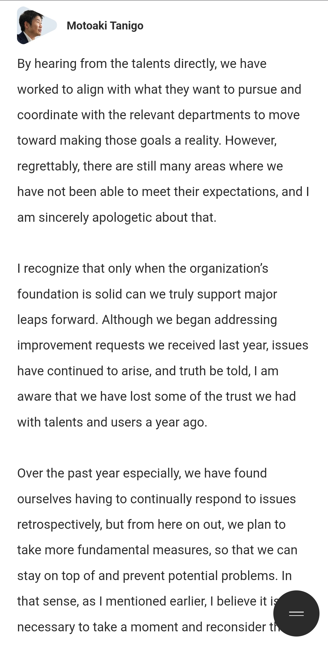 >>109960639None of this really means much, but it is good that they acknowledged the lost trust not just with the fans but the talents as well.I hope things improve.