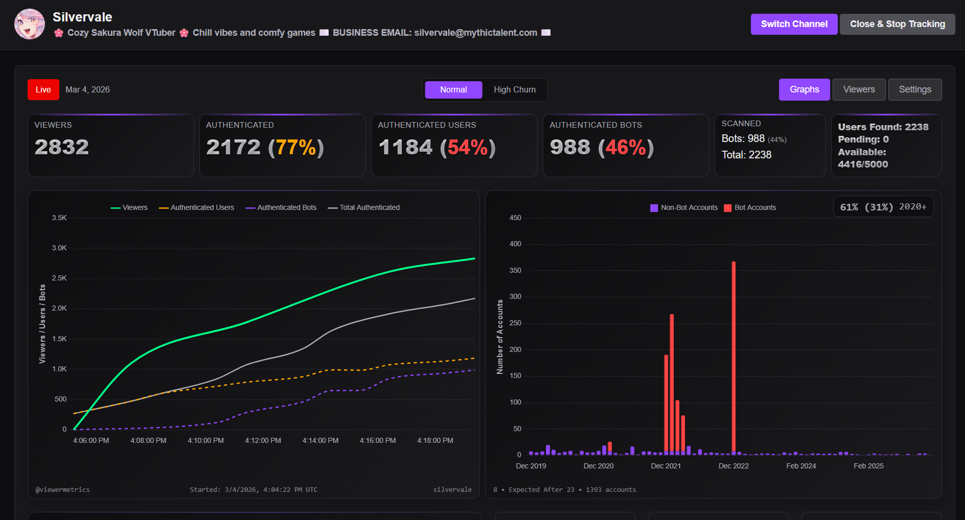 Silver with nearly 3k viewers... but 1k of them are confirmed bots. And strangely enough, about 6k of her viewers are logged out. It's not unusually for people to have a few logged-out viewers, but it's very suspicious when they make up a significant portion like this. We're probably looking at 1.2k real viewers and 1.6k bots, meaning that nearly 60% of her viewers for this stream are bots.