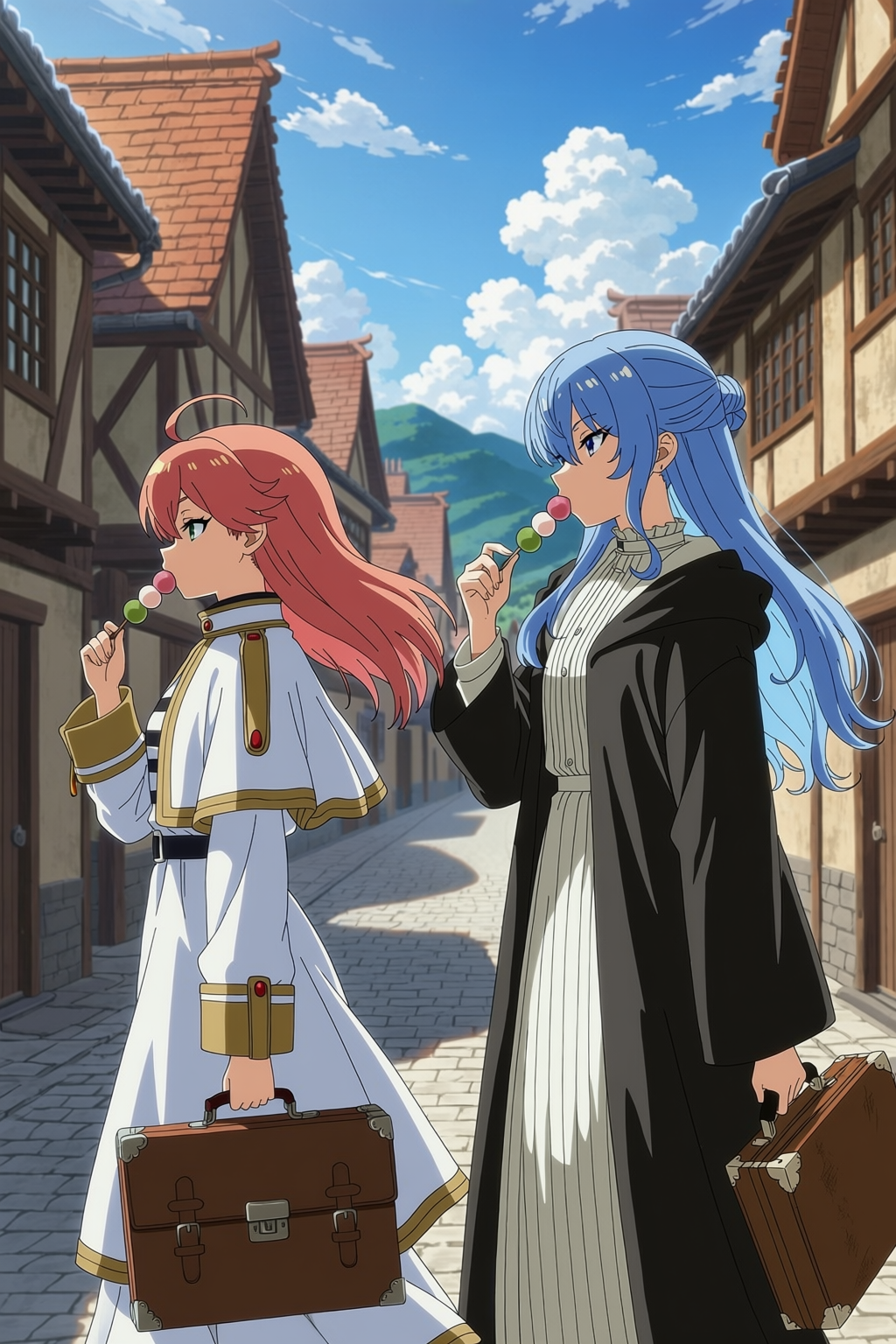 <prompt> <quality> <tag>masterpiece</tag> <tag>best quality</tag> <tag>official art</tag> </quality> <style> <tag>anime style</tag> </style> <characters> <character> <name>hoshimachi_suisei</name> <cosplay>frieren (sousou no frieren)</cosplay> </character> <character> <name>sakura_miko</name> <cosplay>fern (sousou no frieren)</cosplay> </character> </characters> <composition> <tag>2 girls</tag> <tag>upper body</tag> <tag>walking side by side</tag> <tag>from side</tag> </composition> <actions> <character_action character="hoshimachi_suisei"> <tag>holding briefcase</tag> </character_action> <character_action character="sakura_miko"> <tag>eating dango</tag> </character_action> </actions> <setting> <location>village</location> <series>sousou no frieren</series> </setting></prompt>