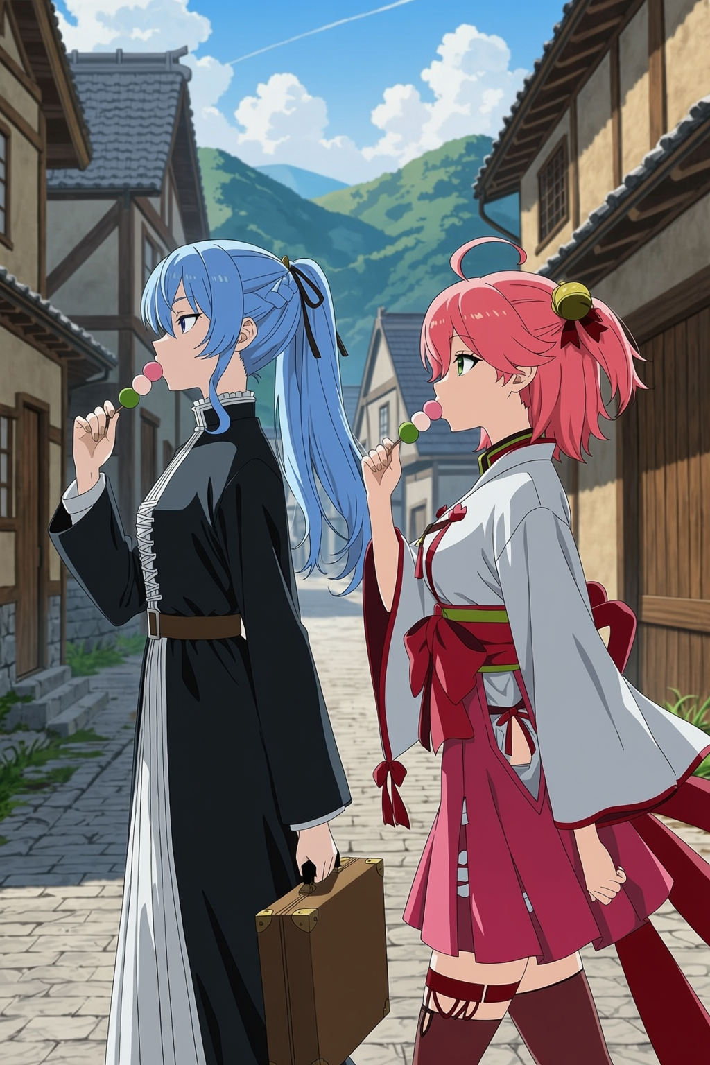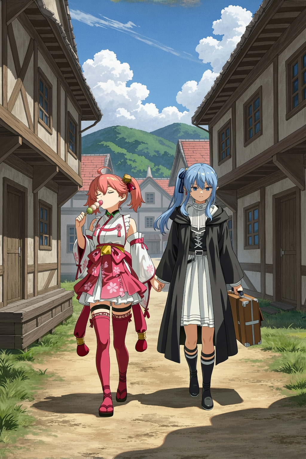 >>109966436I'm testing different approaches to see which one works better.masterpiece, best quality, official art, anime style, 2girls, hoshimachi_suisei as frieren (sousou no frieren cosplay), sakura_miko as fern (sousou no frieren cosplay), upper body, walking side by side, from side, hoshimachi_suisei holding briefcase, sakura_miko eating dango, village background,
