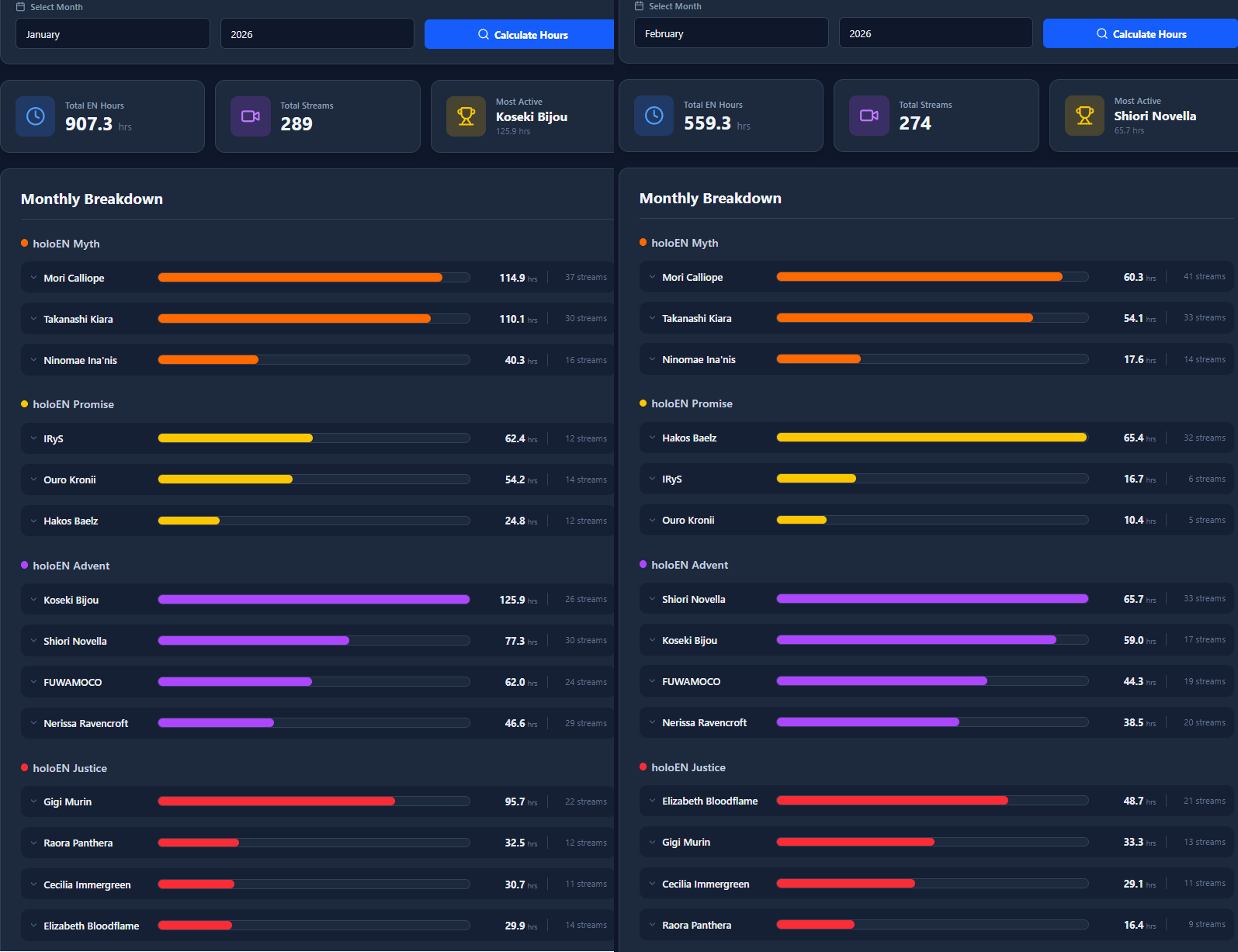 >>109972053Just using data from https://holo-tracker.vercel.app/ and adding up the numbersMori 198.5Biboo 196.1Kiara 173.0Shiori 143.0GG 128.9FWMC 110.2IRyS 94.1Nerissa 92.2Bae 90.9ERB 87.2Kronii 67.6CC 61.4Ina 57.9Raora 50.4