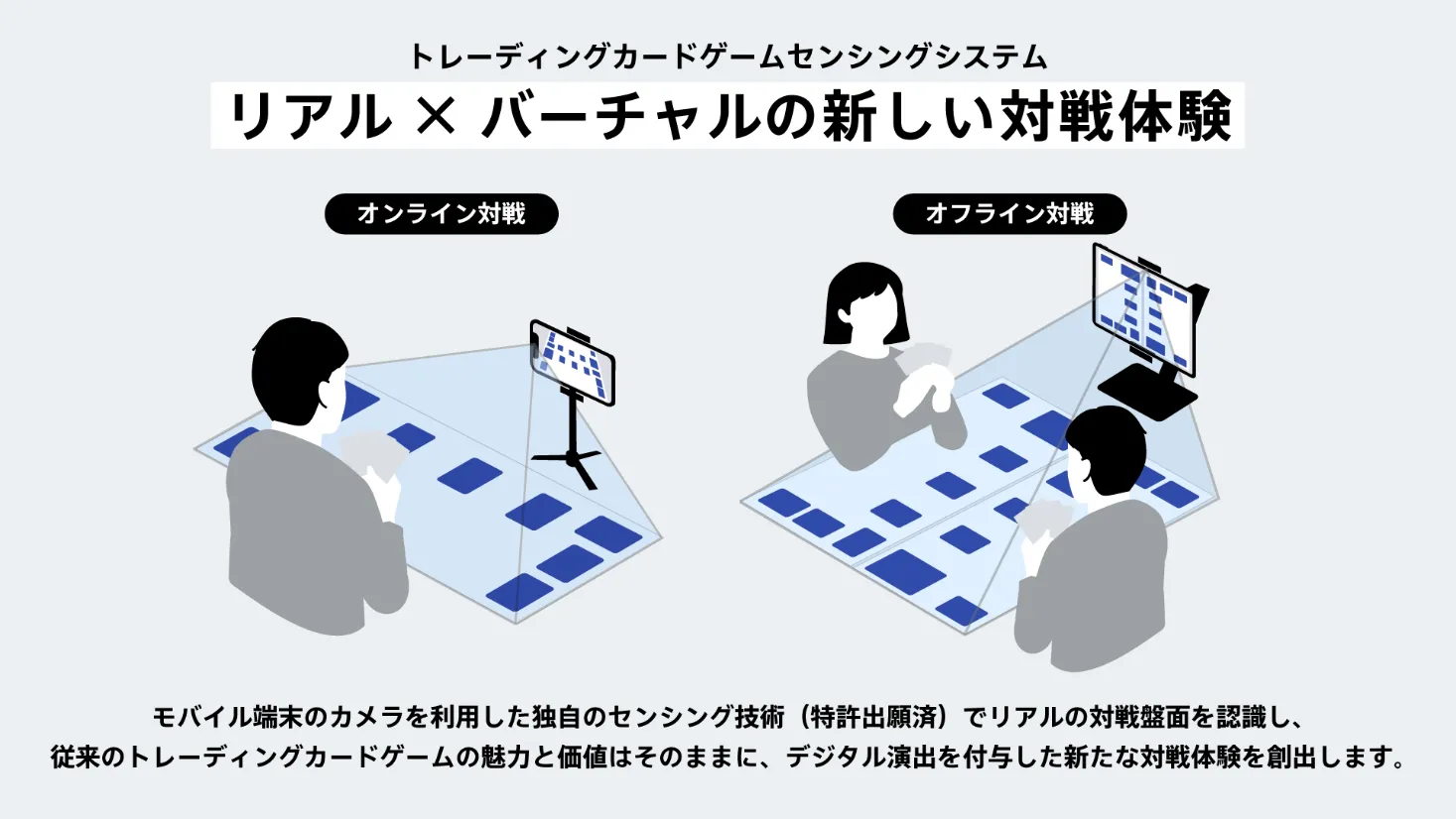 https://cover-corp.com/news/detail/c2026030901>「トレーディングカードゲーム(TCG)センシングシステム」についてソニーが開発中の「TCGセンシングシステム」は、モバイル端末のカメラを利用した独自のセンシング技術(特許出願済)で盤面を認識し、従来のトレーディングカードゲーム対戦に、リアルタイムでデジタル演出を融合させる革新的なシステムです。トレーディングカードゲームのオンライン/オフライン対戦のいずれにも対応し、離れた場所にいるプレイヤー同士でも、お互いの盤面をデジタルデータとして共有することで、リアルなカードを使いながらオンライン上で臨場感のある対戦が可能となります。デジタル演出やガイダンスを自動的に表示することで、ルールを覚えたり、プレイエラーを防止したり、プレイヤーの対戦体験をより豊かにし、競技性向上に貢献することを目指して開発が行われています。また、対戦相手を見つけるというトレーディングカードゲームにおける課題の一つに対する解決策として、AI対戦の提供を予定しています。さらに、センシング技術を活用した自身の対戦結果の振り返りや、世界中の対戦を観戦してその結果を閲覧できる仕組みの実現を目指しています。
