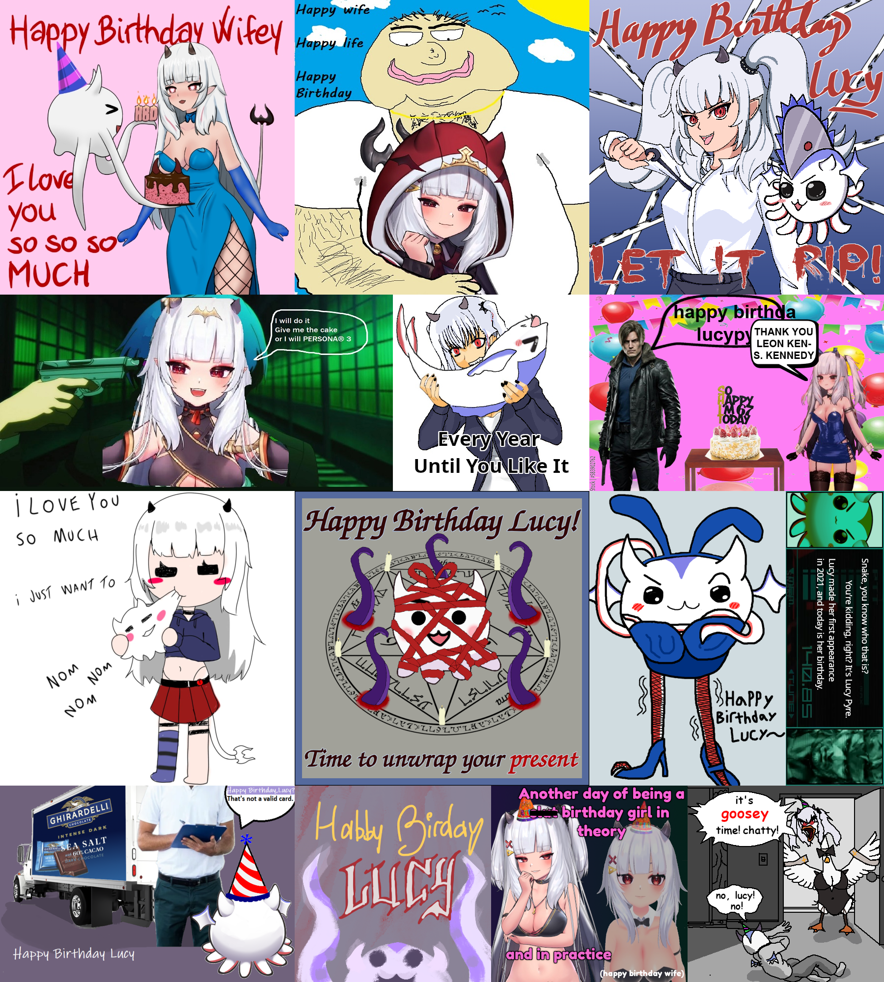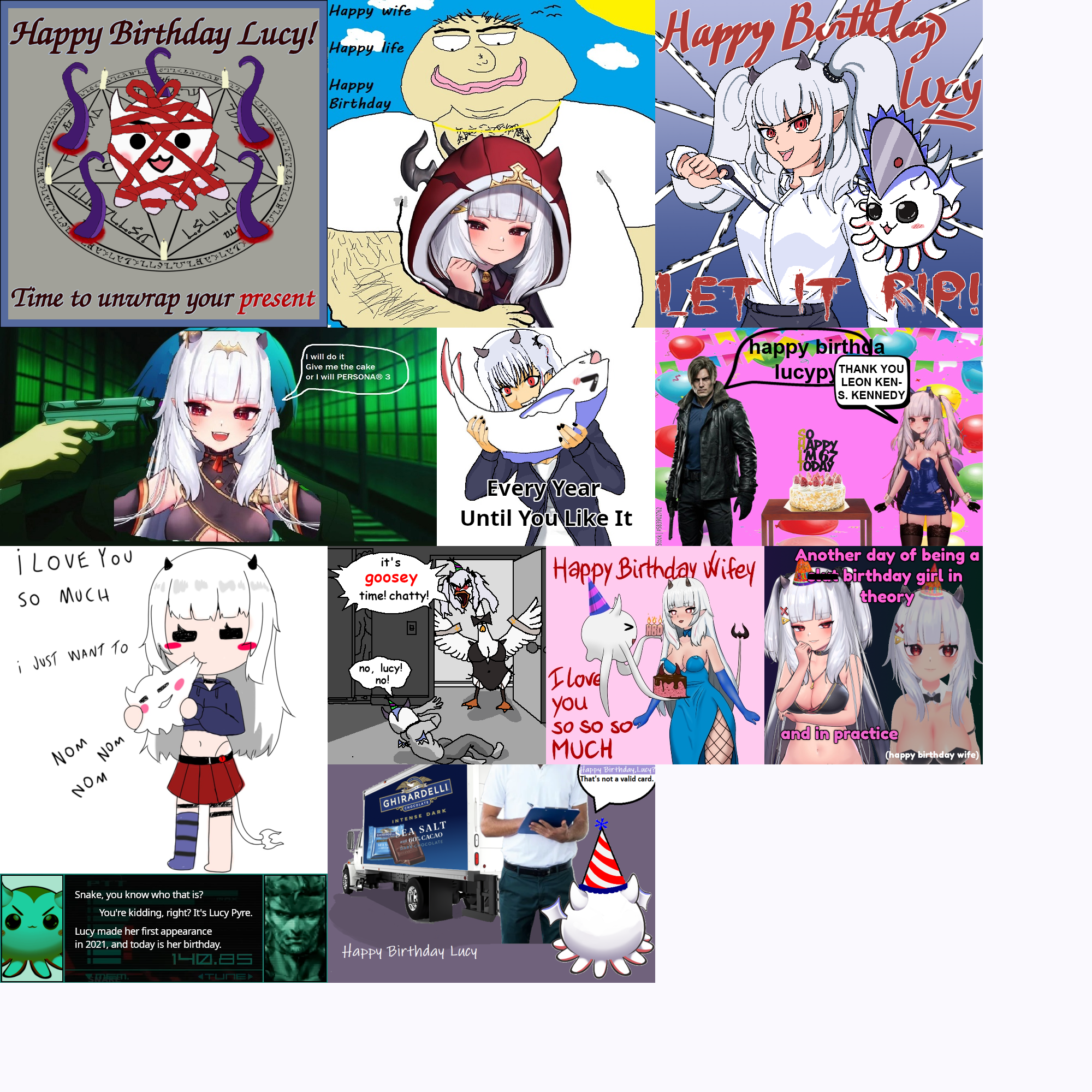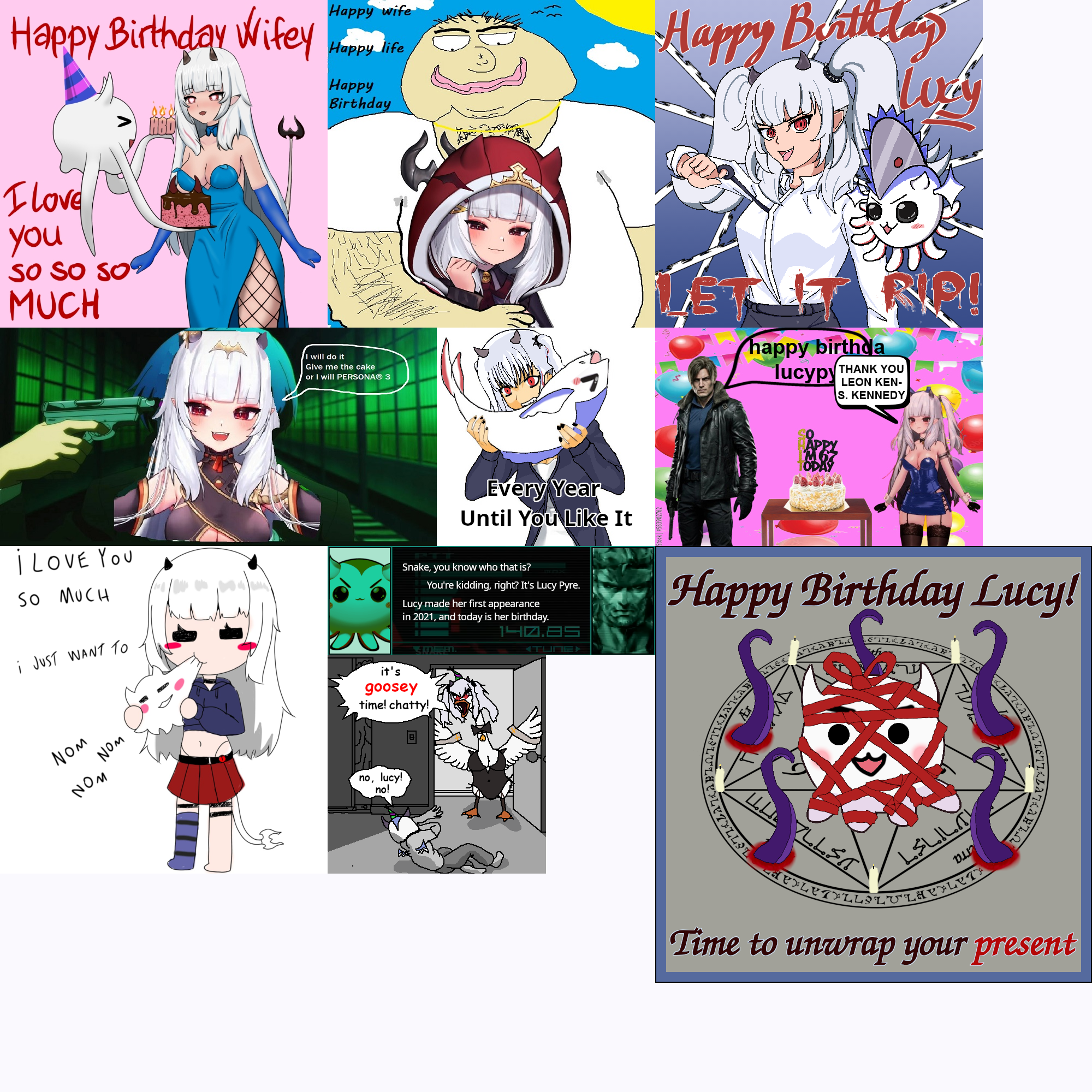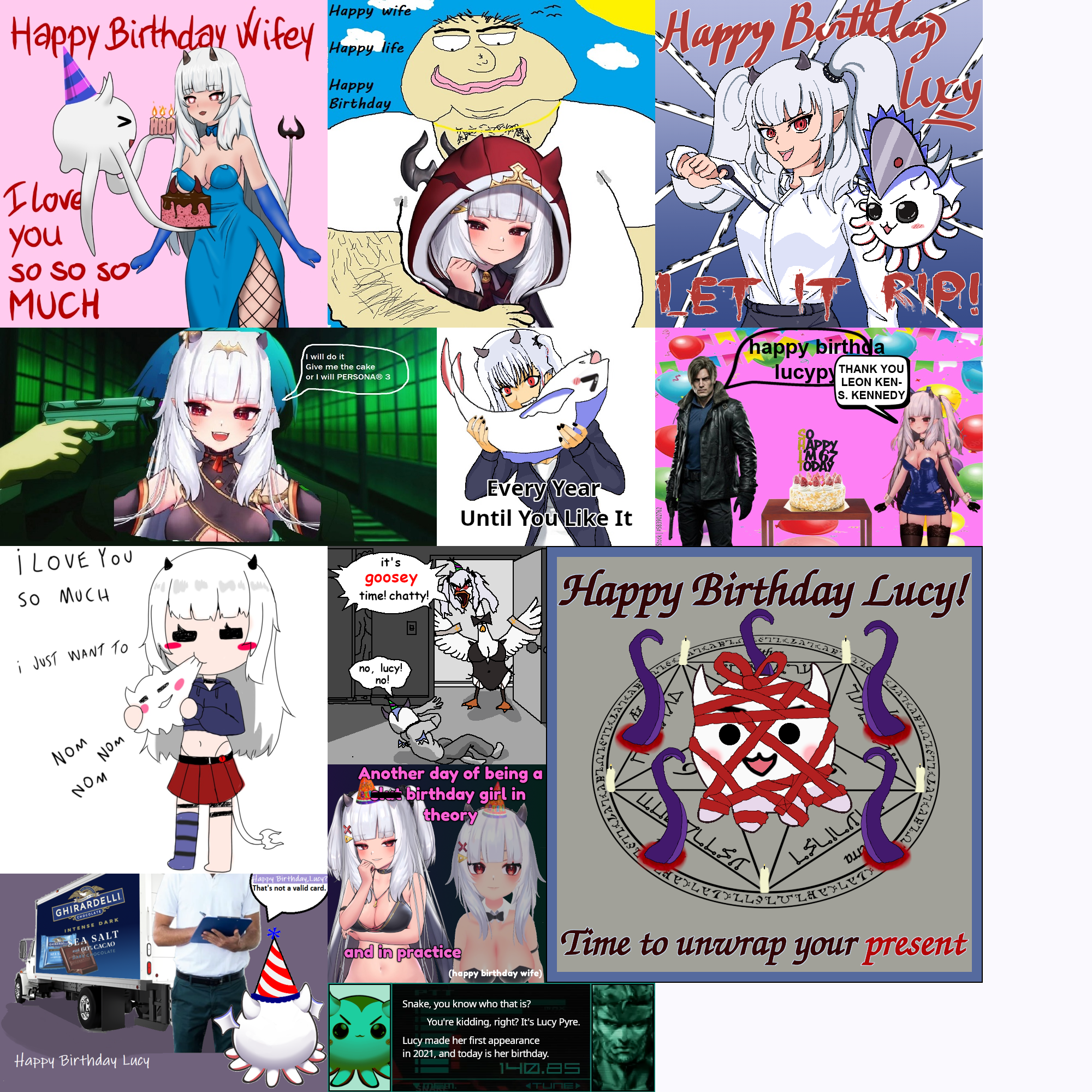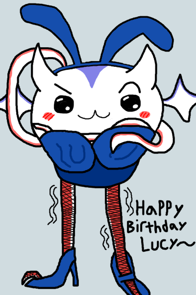 2 HOURS LEFT!!! It's the Lucy Pyre birthday card! Show your appreciation for Lucy! Submissions must be SFW and have image dimensions that are a multiple of 200 (i.e. 200x200, 400x400, 200x400).Likes:>persona (3)>elden ring/sekiro/bloodborne/dark souls 3>resident evil 4 (leon)>silent hill 2>zelda>rune factory (4)>stardew valley>harvest moon>rhythm games (miku, love live)>visual novels (piofiore, nekopara, otome, yaoi)>anime (lucky star, dokuro-chan, code geass, nanoha, sailor moon, madoka, love live, fate, shugo chara, tokyo mew mew, fruits basket, naruto, death note, magi, inukami, rosario + vampire, chainsaw man, to love ru)>anime figures>my bad, i forgot you were fragile>clock strikes 12>6 7>twilight>heated rivalry>baseball>cats>strawberry sponge cake/cheesecake>boba tea>panda express (double kungpow chicken, no peppers, super greens, chow mein)>dark chocolate (60% ghirardelli, higher percents mixed with caramel/almond butter/mint)>pickles>ranch dressing>japanese language (n1 certified)>scented candles>tentacles>mcdonalds (nuggies, burger no cheese no lettuce no tomato)>fishing minigames>honkai star rail>pokemon (torchic, mimikyu, cynthia, gen3)>ffxiv>autism/cringeReference: https://mega.nz/folder/B7F0WKCR#RGRK4CLutHL7epkc2Rbj_A/folder/lu0RSSzS