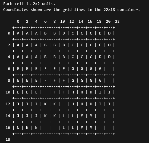 >>110006263this is the list of tiles and their dimensions I put it into chatgpt and it gave me picrel but said it was impossible to eliminate gaps without rotating6x2 6x6 6x6 6x6 6x6 6x6 4x4 4x4 4x4 4x4 4x6 8x4 6x4 6x4