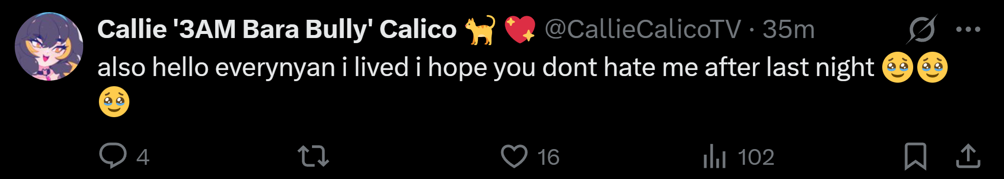 Welcome to /3AM/! A thread to discuss current and former members of the livestream team 3AM Virtual Talent.3AM includes:Meat- https://www.twitch.tv/meat>YouTube: https://www.youtube.com/@meatscaveCoqui- https://www.twitch.tv/COQUI>YouTube: https://www.youtube.com/@c0quiCallie- https://www.twitch.tv/calliecalico (embed)>YouTube: https://www.youtube.com/@callie-calicoSnuffy- https://www.twitch.tv/snuffy>YouTube: https://youtube.com/@snuffyowoVivi- https://www.twitch.tv/vividlyvivi >YouTube: https://www.youtube.com/@vividlyVIVIAll Talent Links: https://3am.moe/talentFormerly:Olivia- https://www.twitch.tv/oliviamonroe Fang- https://www.twitch.tv/fangguuLyra- https://www.twitch.tv/LyraIsaa- https://www.twitch.tv/isaa3AM links:https://3am.moe/https://twitter.com/3am_talenthttps://www.patreon.com/3am_talenthttps://www.youtube.com/@3AM_Talenthttps://merch.kawaentertainment.com/collections/3amRelated threads:>>>/vt//wvt/>>>/vt//lig/>>>/vt//big/Previous thread: >>109947814