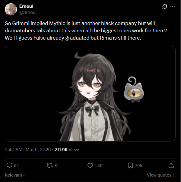 https://x.com/i/status/2030759238277206274Grimmi doubled down and went full anti Mythic with deme supporting her in replies
