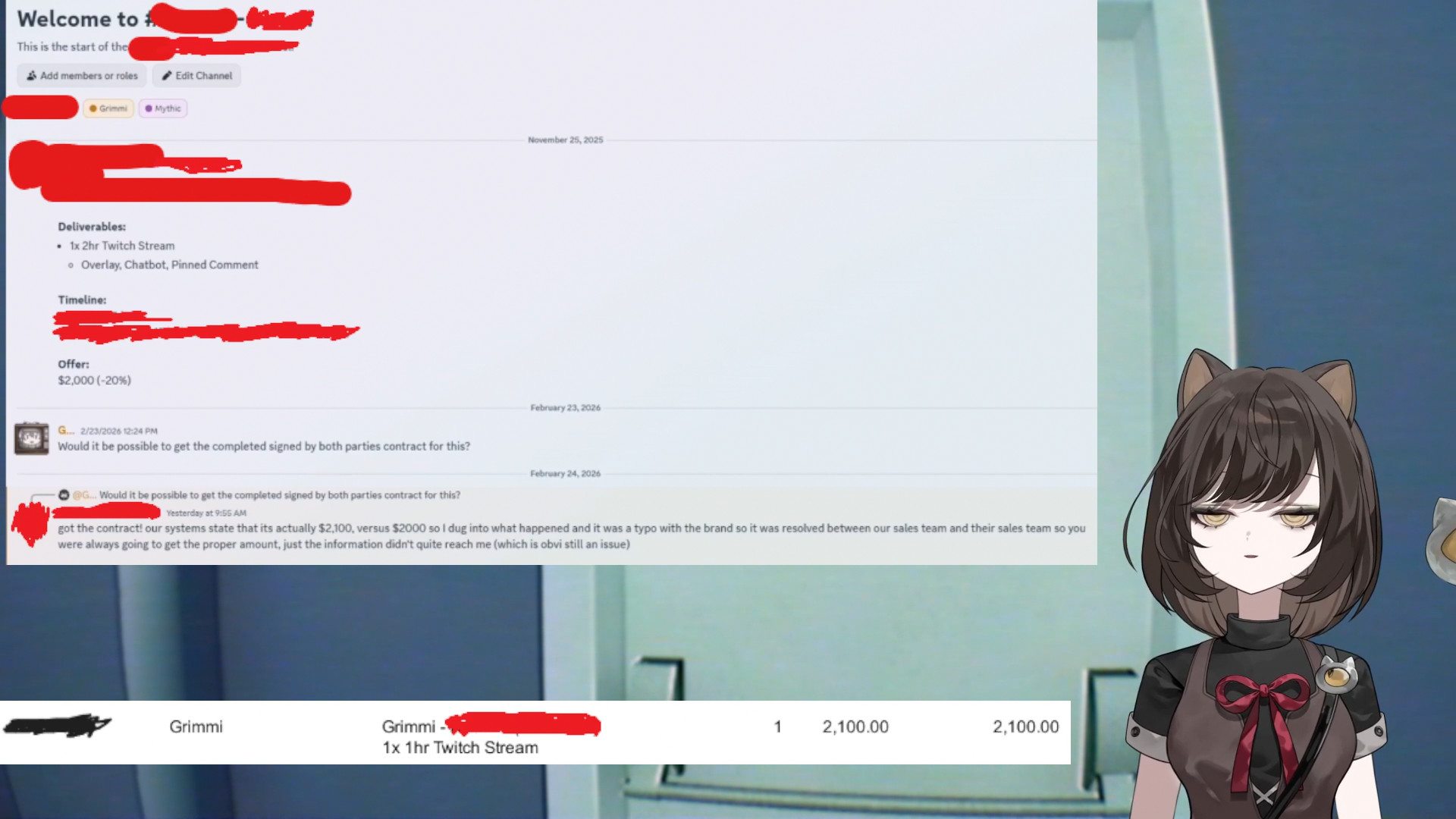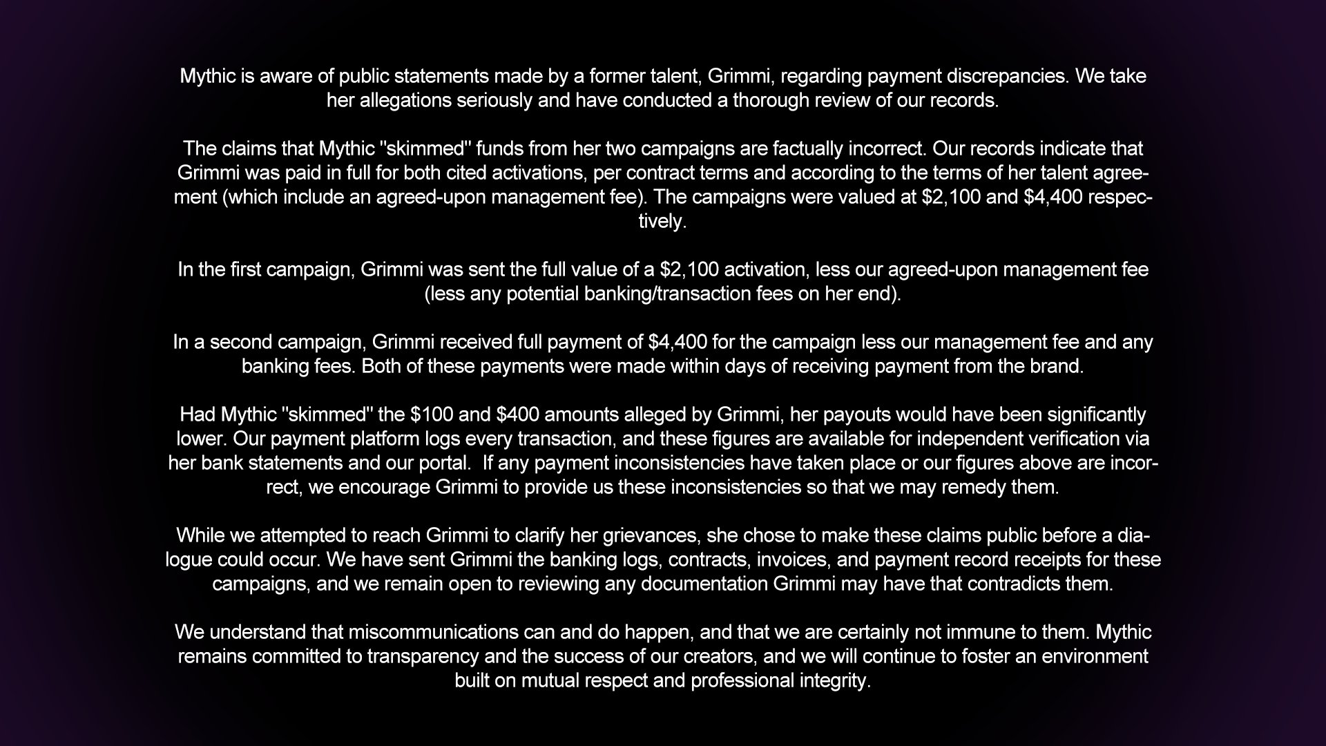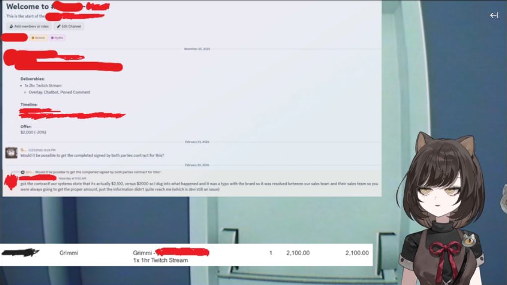 I was watching the stream earlier.Basically the tl;dr is:>Grimmi alleges (and she makes clear that this is "alleged") that Mythic was skimming a little extra off the top of the sponsorships.>Grimmi made it clear that the issue wasn't the money itself, the the sponsorships were a lot of money for her and she wouldn't have minded giving Mythic more if they asked for it. However, the fact that they disrespected her and lied made her lose trust in them and this is why she left Mythic.>She showed screenshots of two instances on stream where she verified the actual amount with the publisher.>The first instance she showed is >>110033722 and basically they negotiated to pay out $2,100 to Grimmi from the publisher then skimmed an extra $100 (5%) only paying $2,000. When confronted about this they claimed it was a typo and she got paid the correct amount.>The second instance she showed had the publisher negotiating a payout of $4,400 to Grimmi but she only got $4,000 with $400 being skimmed (10%). When confronted about this they claimed it was because it went through a marketing agency. However, this was negotiated with the same publisher through the same e-emails as the previous instance.>She said she had more stuff but wanted to keep stuff for herself in case this went to court.>When she asked Mythic to see the negotiation documents they refused to show them to her.>She said that anyone who is with Mythic right now should also ask verify their stuff and ask to see their negotiation documents.>She said she doesn't know how big this is, that it could just be one employee or it could be worse.>She doesn't know if it will end up going to court at this point.>After she finished talking about it she said she doesn't want to talk about this anymore and doesn't want anyone to bring it up in her presence again (including during the rest of the stream). She said she would be taking a week off after this stream.
