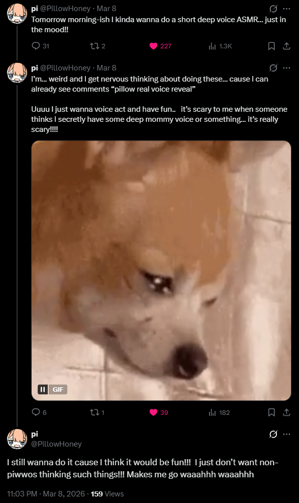 Fluffy Triggers Edition>Previous thread>>109979291>YouTubehttps://youtube.com/@pillowdearhttps://youtube.com/@CushionHunASMR>Twitter/Xhttps://x.com/pillowdearasmr>Merchhttps://uwumarket.us/collections/pillowdearasmr>Fan website & resourceshttps://piwwow.love/>Fan wikihttps://virtualyoutuber.fandom.com/wiki/PillowDear>Latest coverhttps://www.youtube.com/watch?v=Ns08Y6GYWEc>Latest eventhttps://www.youtube.com/watch?v=8C6LGy2A4S8 >Latest streamhttps://www.youtube.com/live/BNkOXLL9aBQ>Upcoming streamTBD