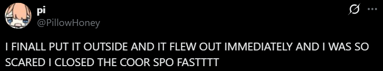 >>110104324>>110104372>>110104516We need to convince Pillow to get an airsoft pistol to deal with anymore potentially dangerous bugs.