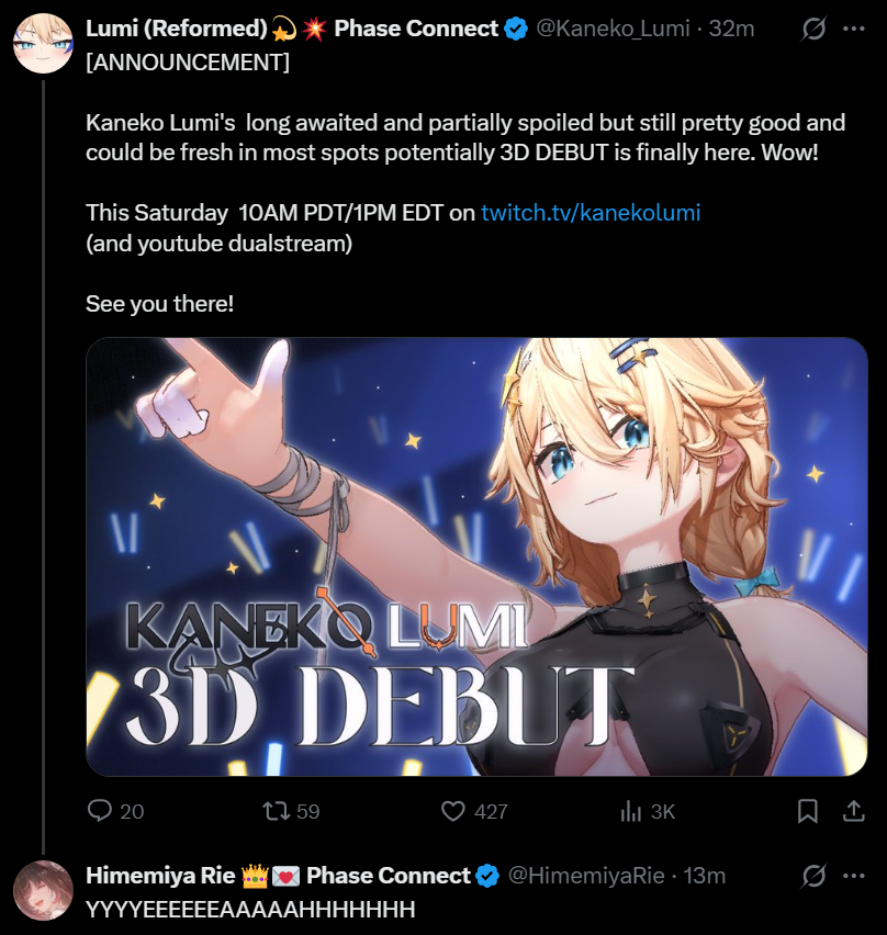 >>110109557Filian announcement will be shadow dropped when she shows up in Lumis 3D debut.