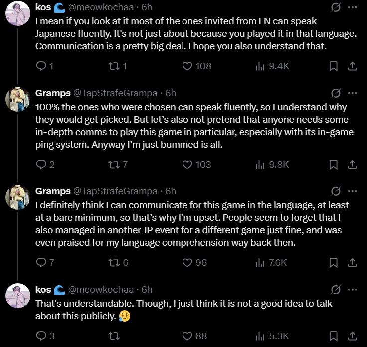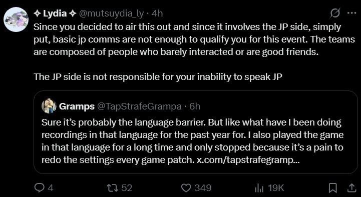 >>110115100That's exactly his point. He speaks the language well enough to play Apex with Japanese players, but the company cited the language barrier as the reason he can't participate in the Apex tournament with Japanese players.
