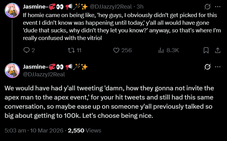 how about instead of crying like a bitch on twitter, speak up and say>I would like to be kept in mind for future APEX events if possible. What do I need to improve on to be considered?they didn't pick you because they didn't want you this time. if there is a next time, they almost certianly wont look your way now cause you acted like a bitch