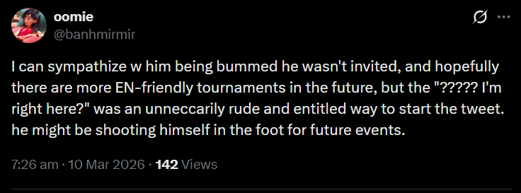 >>110112776I don't really understand what his point is. Selen had played Apex with Kanae and Qu-Chan for one of the ShibuHal events years back and the only mitigating factor was that Kanae invited her to play on his team because she is/was a washed up top 500 apex player. Kanae straight up said he hardly understood Selen and his English comprehension is passable for a JP.Every APEX tournament revolves around getting to know each other BESIDES in-game comms. Ryoma should get over himself instead of posting about it knowing everyone knows his irl alt.