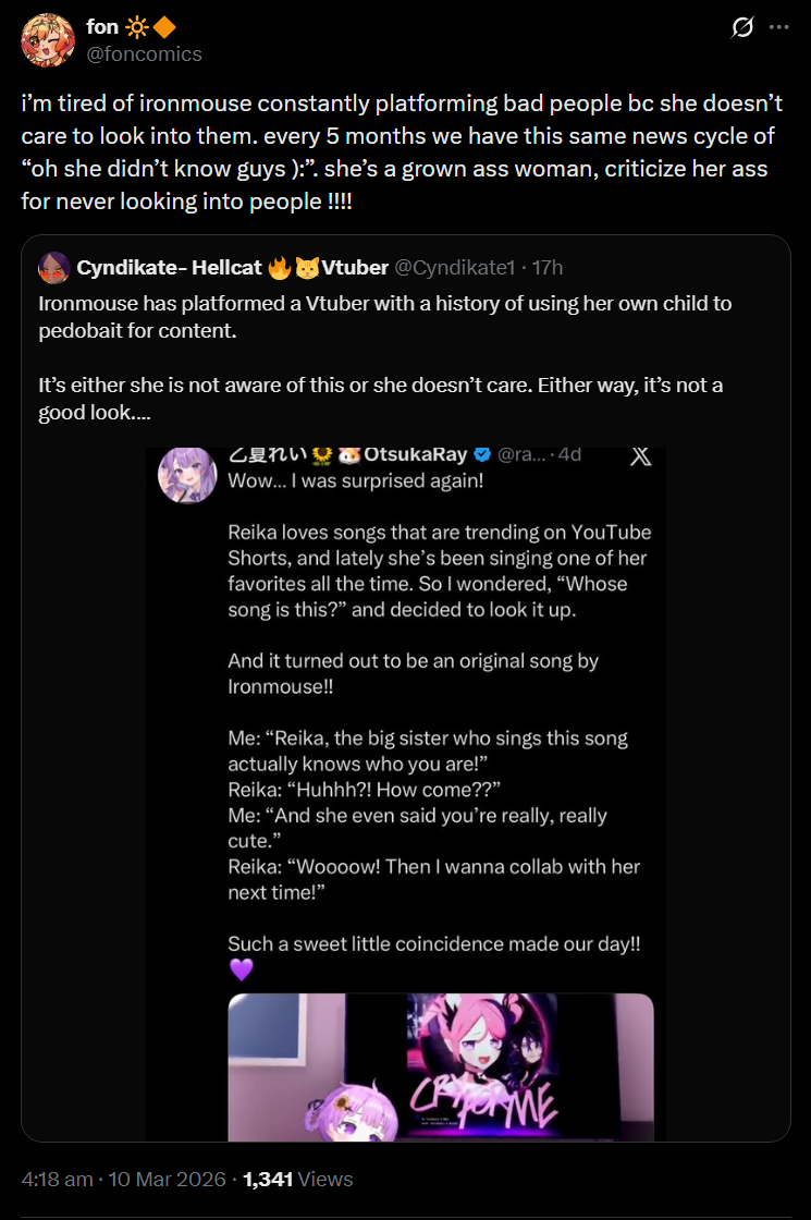 Otsuka Ray is the kind of person who pimps out her 5-year old daughter into vtubing for clicks. Otsuka Ray associates with Phase Connect, which tells you something. Her daughter will be in danger one day and everybody will be saying "told you so."