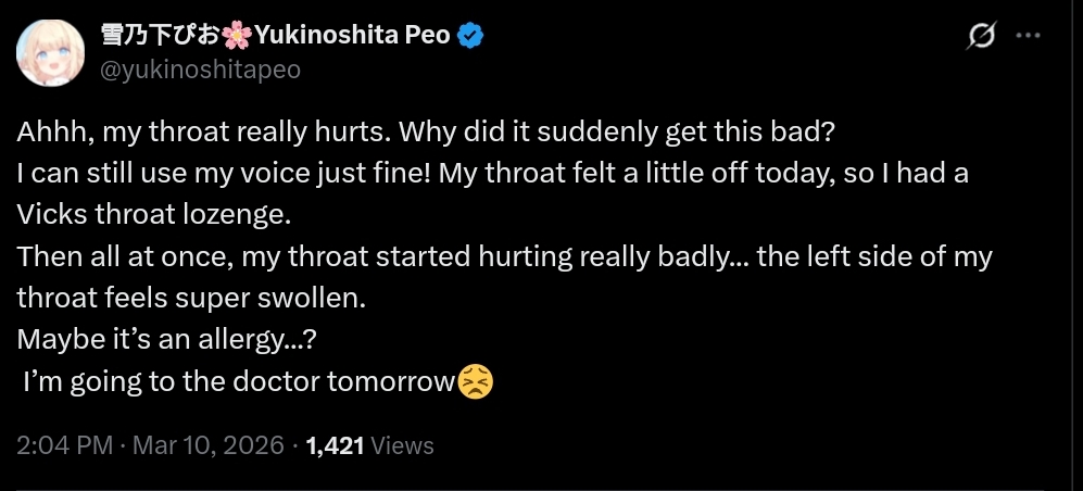 Peo's throat really hurts and is swelling up really bad. She already canceled tonight's stream and is going to the hospital tomorrow. :(