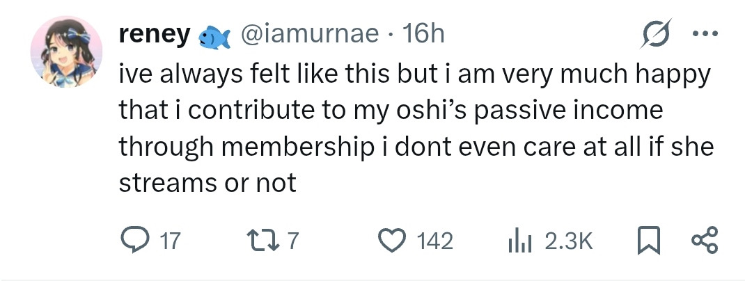 Because vtubing isn't really a zero sum game, if someone is getting more viewers doesn't mean someone else is getting less, aand viceversa. Like, let's Kiara goes on a break. Some of her viewers will watch Shiori, Panko, or some other eu time streamer. But most kfps will just do something else.