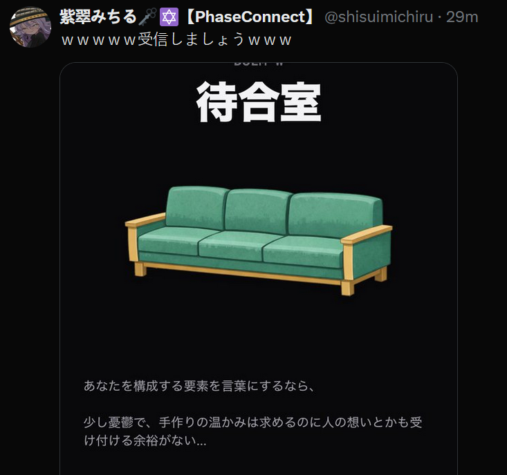 >You are a waiting room. The waiting room of a mental clinic.>Instead of taking tests like this, go get some sunlight, eat three meals, and sleep. I’m worried about you.This quiz determined that da Michi is a NEET.