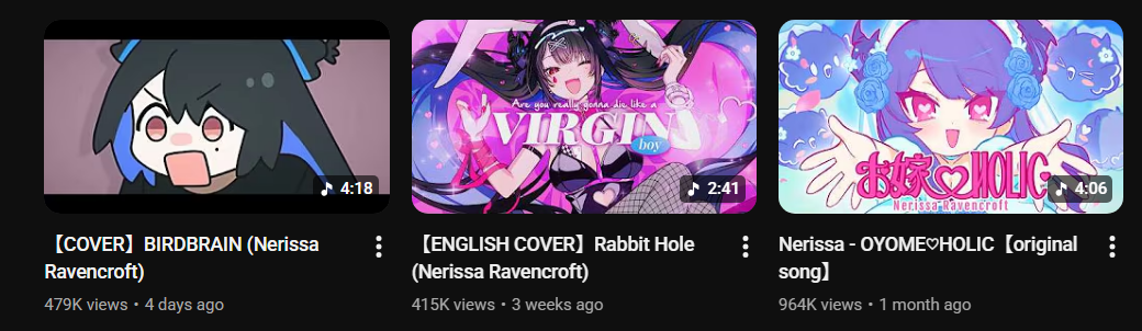 >>110145747>New Music【COVER】BIRDBRAIN (Nerissa Ravencroft) | https://www.youtube.com/watch?v=XdNd0IwiGEo【ENGLISH COVER】Rabbit Hole (Nerissa Ravencroft) | https://www.youtube.com/watch?v=9j6OoMiZpg8Nerissa - WifeHOLIC【original song】 | https://www.youtube.com/watch?v=yFzN8ydNeH8https://cover.lnk.to/OpOIob"Shape the Future" (English ver.) feat. Nerissa Ravencroft 【MV】Live2D | https://www.youtube.com/watch?v=dSvy_Qn8NWkYour Idol (feat. Mori Calliope, Ouro Kronii & FUWAMOCO) | https://www.youtube.com/watch?v=vw9MkB-sNMAGnarly (feat. Shiori Novella, Koseki Bijou & FUWAMOCO) | https://www.youtube.com/watch?v=TxBIA_ePWT0What Goes Around【Advent- Original Song】 | https://www.youtube.com/watch?v=nAkdw_McUD0Breakout【Advent- Original Song】 | https://www.youtube.com/watch?v=ag9t15y7JwYRidin' on Dreams | hololive IDOL PROJECT | https://www.youtube.com/watch?v=Tec7EsQKlKk