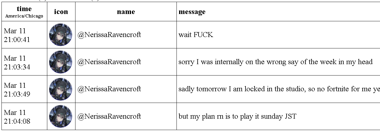 >>110146022 (me)As in, Mio is really sick rn that she had to cancel streams. And everybird knows how fragile Nerissa is both physically and mentally