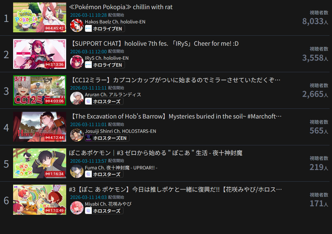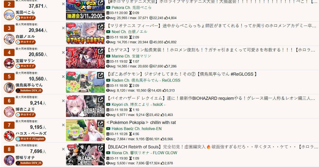 *GENERAL NUMBERFAG SITES*>https://playboard.co/en/>http://ikioi-ranking.com/>https://vrabi.net/>https://vtubertracker.info/en>https://holo-tracker.vercel.app/>https://live-ranking.userlocal.jp/vtuber-rankingHololive sites>https://www.hololyzer.net/youtube/index.html>https://trackholo.live/en/>https://holo-spotify-stats.jirikunes.eu/Twitch>https://sullygnome.com/>https://twitchtracker.com/>https://stats.roki.sh/>https://streamscharts.com/