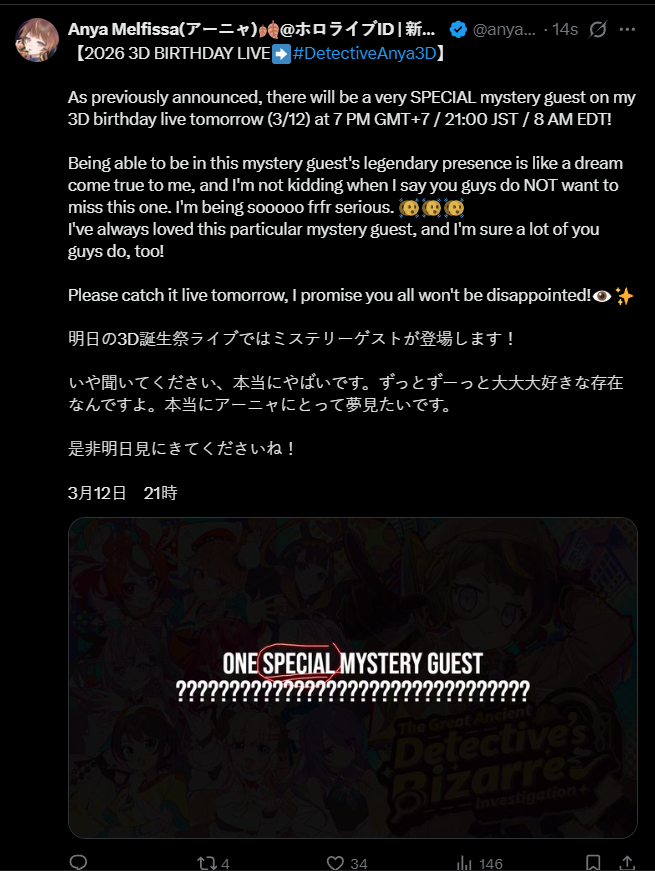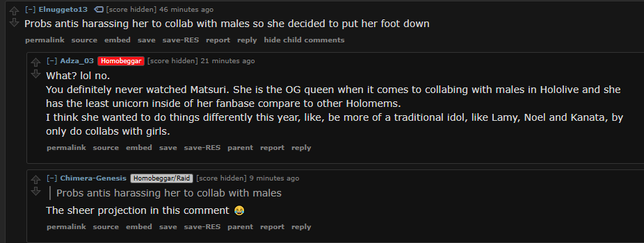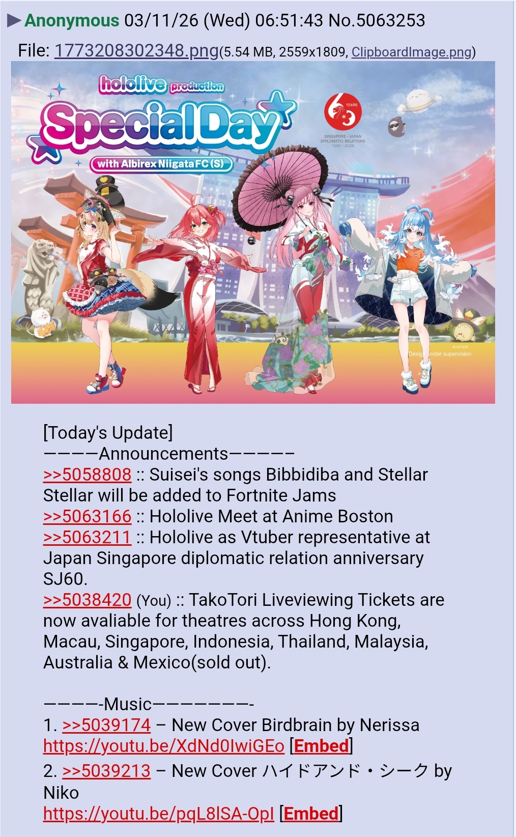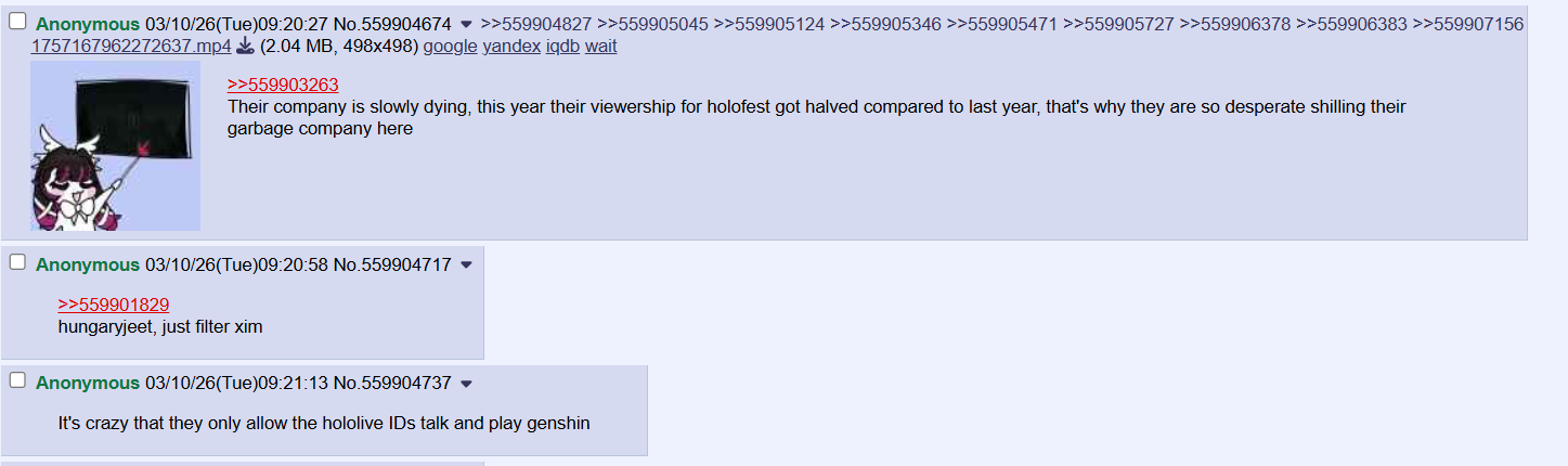 >>110152419>>110152501>>110152544I still recall when the EN grads happened shitters were always rushing to the "they gonna go full homo" angleThen 2025 happened and the homos got shafted out so MUCH shit, the funniest one was the 8th anniversaryNow we kick off 2026 with their numbers at their lowest, the expo being a lot of nothing and Matsuri releasing a nuke on beggars.