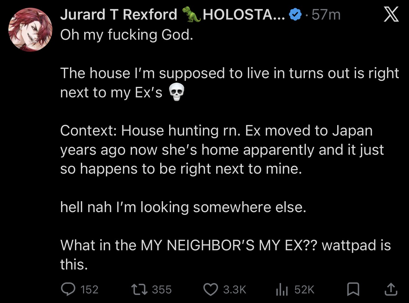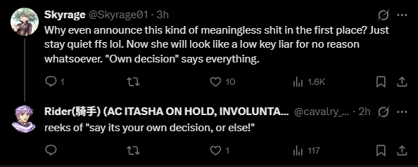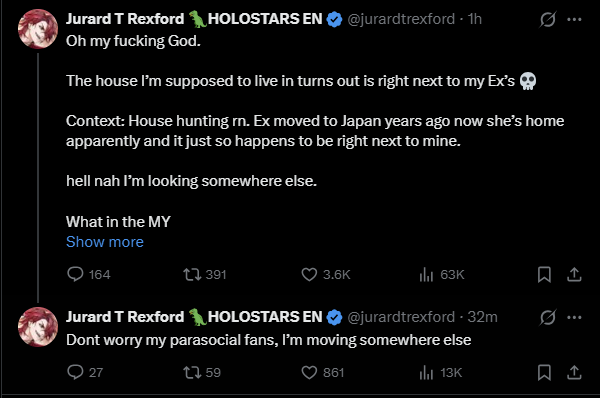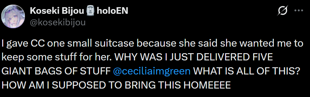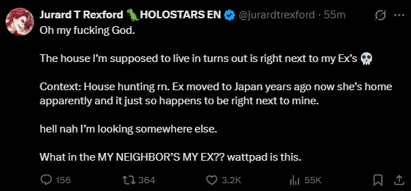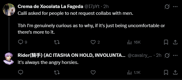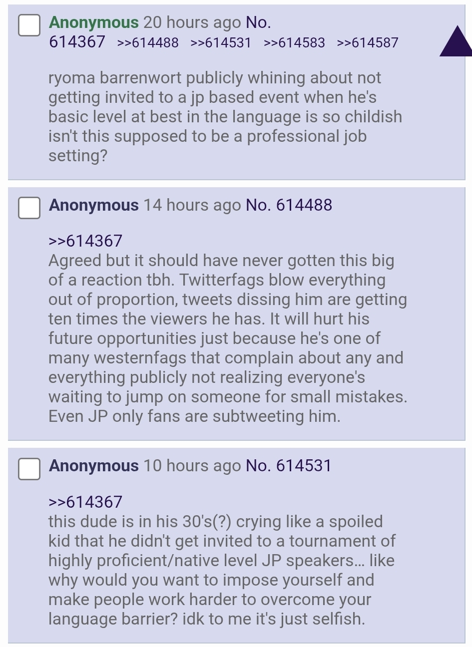 >>110147731niji drama most likely but there was also the beggars getting bad news and holofes just happened so there is a lot of leftover seethe from that