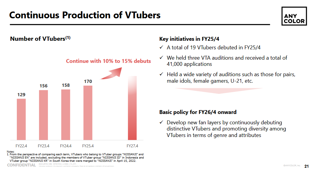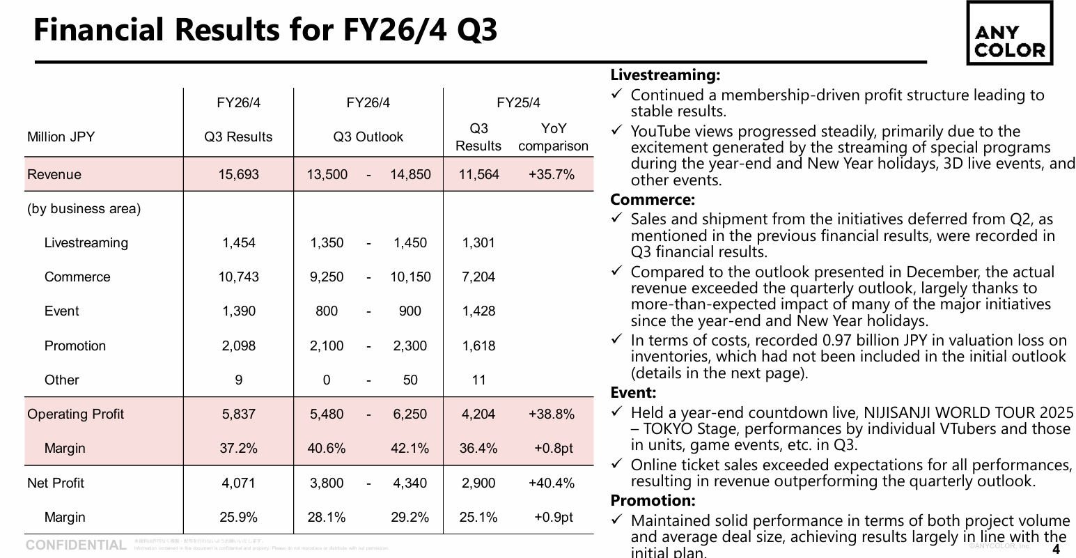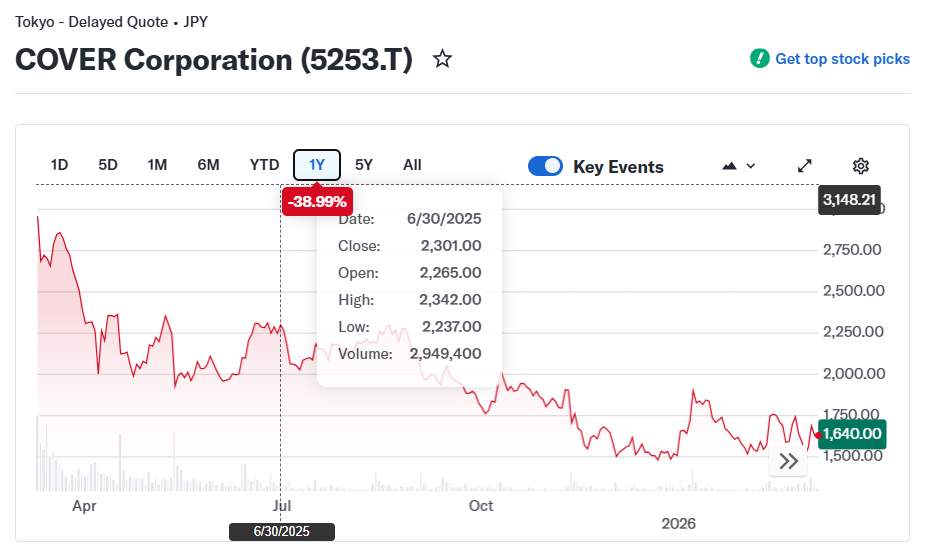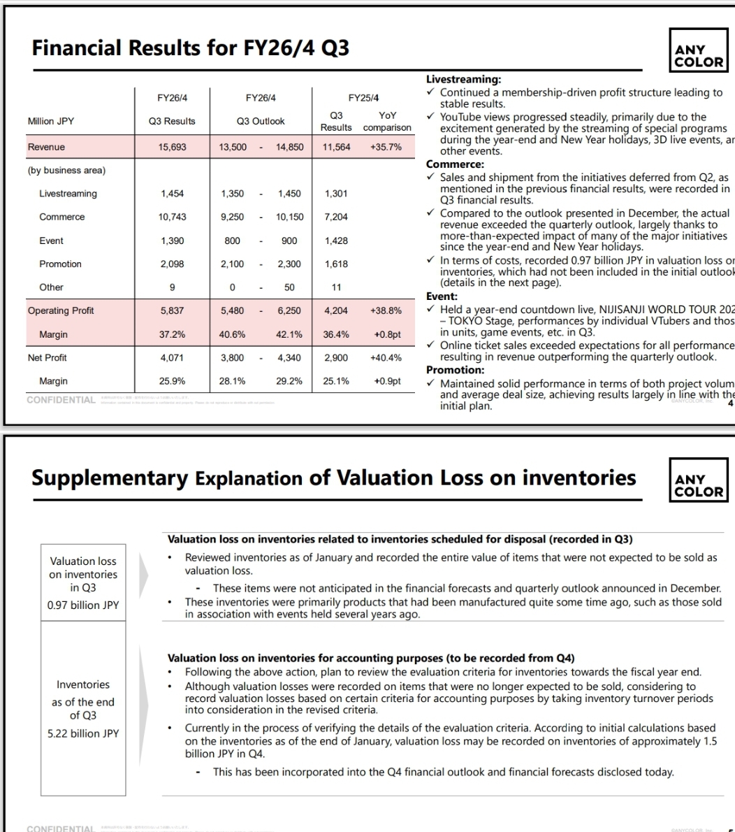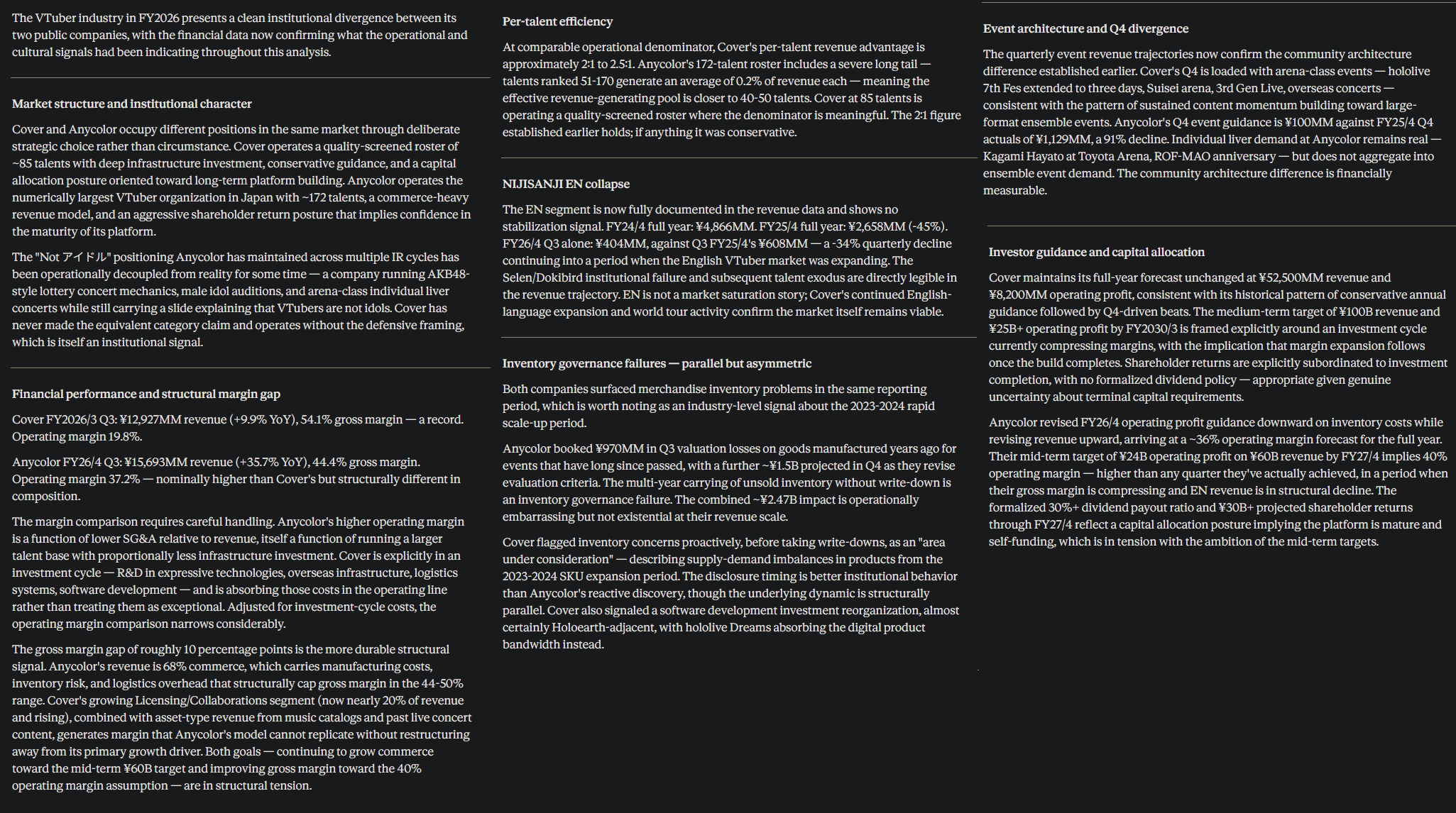 Summary:Cover is building infrastructure and deferring returns until the build completes, with conservative guidance, record gross margins, and a talent model that generates 2:1+ per-talent efficiency against the industry's largest roster. The current margin compression is investment-cycle-explained and the Q4 event pipeline suggests the annual forecast will be met or exceeded.Anycolor is a financially larger business by revenue running a structurally lower-margin model, harvesting a mature commerce platform while projecting growth targets whose internal assumptions are increasingly difficult to reconcile with the EN collapse, inventory governance failures, and commerce-heavy revenue mix that caps gross margin below the level required to hit the mid-term operating profit target. The aggressive shareholder return commitment and the ambitious mid-term plan are pulling in opposite directions, and the capital structure reflects confidence in platform maturity that the operational signals don't fully support.