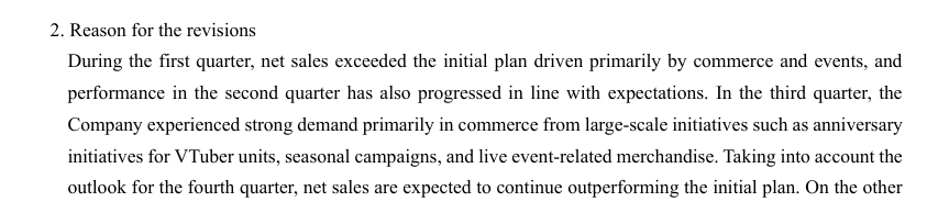 >>110147929>Taking into account the outlook for the fourth quarter, net sales are expected to continue outperforming the initial plan.Nijisanji keeps on winning