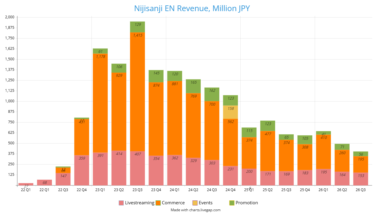 >>110147981One thing to note is that the NijiEN commerce totals here should include the special Luxiem Ukiyoe merch, which were priced at $430 each. (they shipped in November & January)So I wouldn't be surprised if NijiEN Q4 commerce is absolutely terrible when the next report comes out in June.