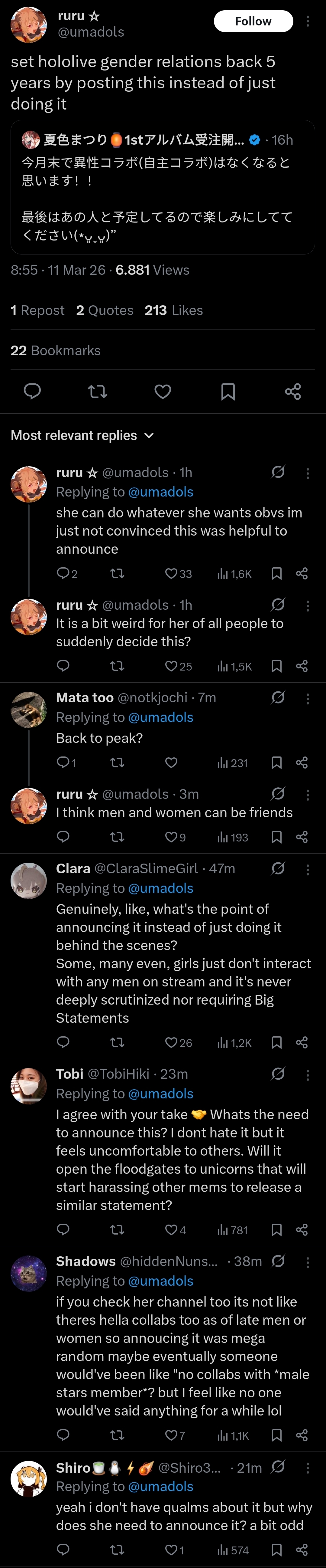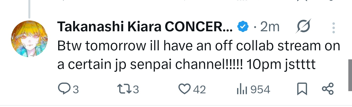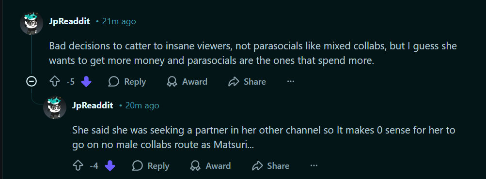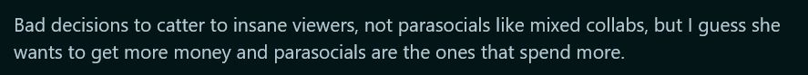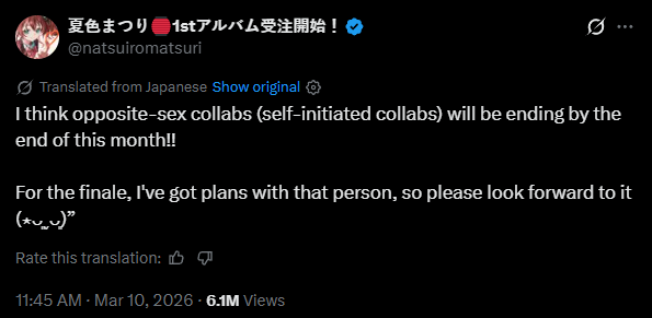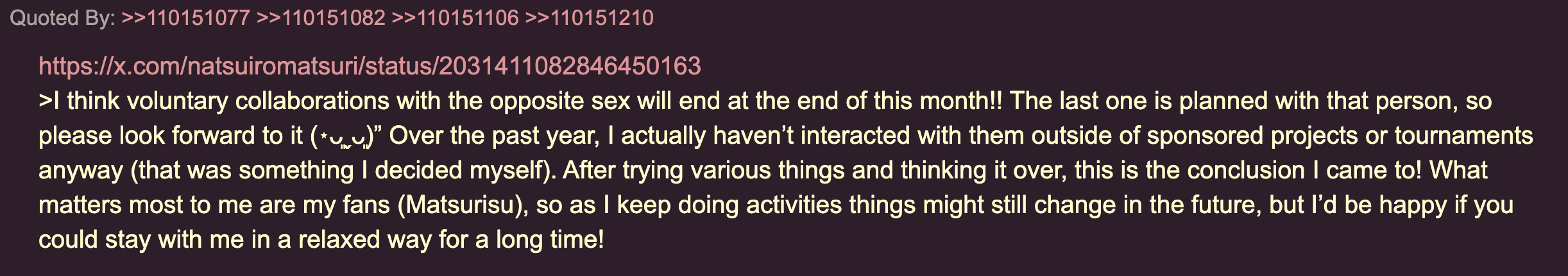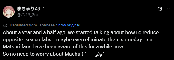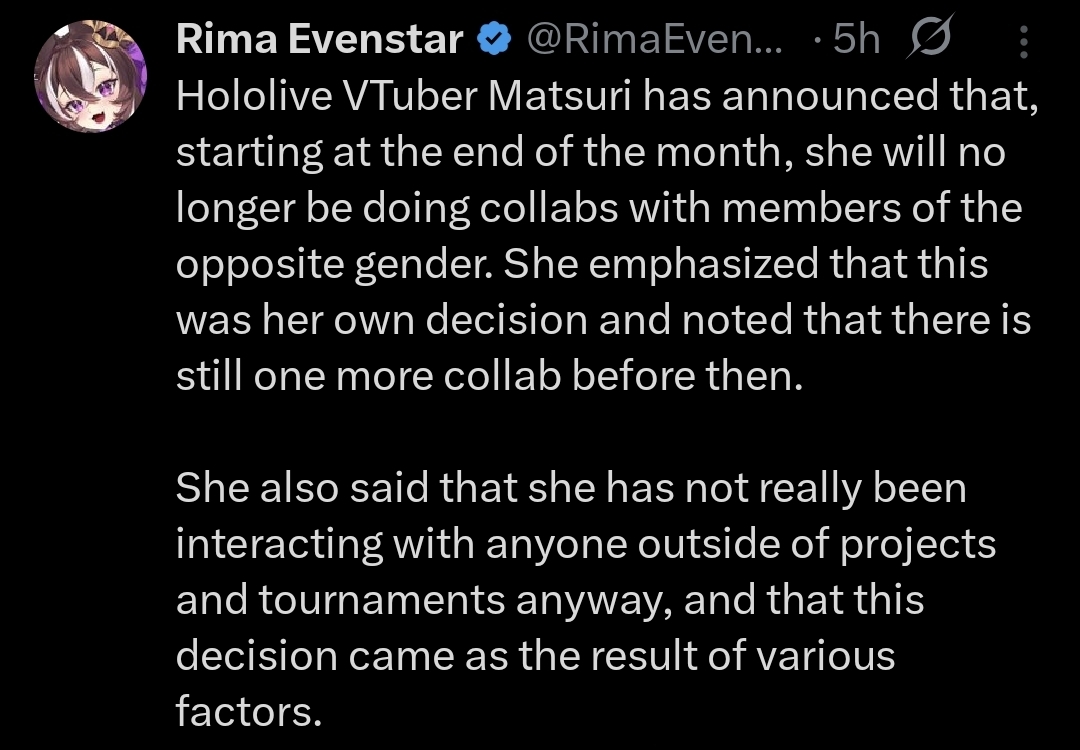 >>110152419Basically:- I realized I don't really have a hardcore fanbase because of my decisions- I decided to stop collabing with males to help foster that more- This decision wasn't simply only that, I also haven't been collabing much with the other hololive members or joining tournaments as much and I realized this really won't do well for my future activities.