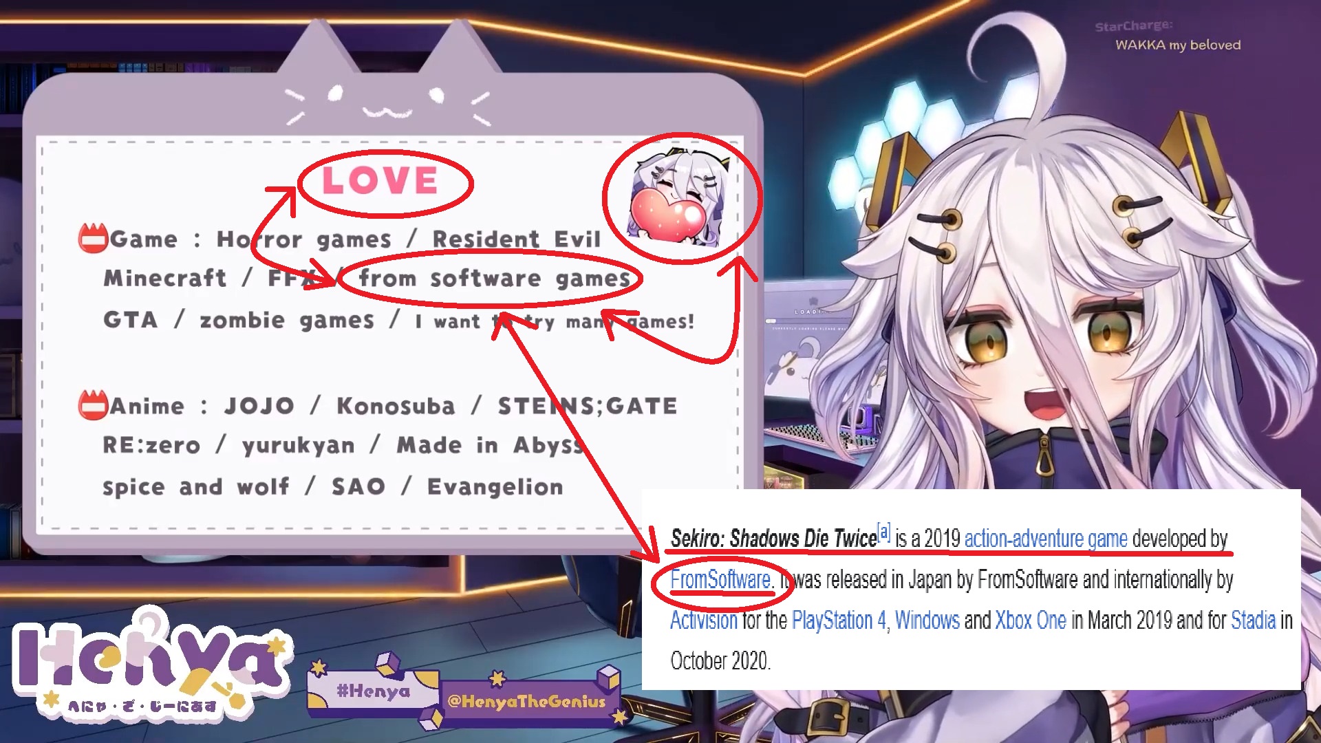 >>110199554For Mega Man I can understand your argument, but with Sekiro it's just pure autism. I already know she likes From Software games and Sekiro is not more difficult than Tomb Raider, just to name a game she played recently.But it's fine, I love Henya, including her autistic side.