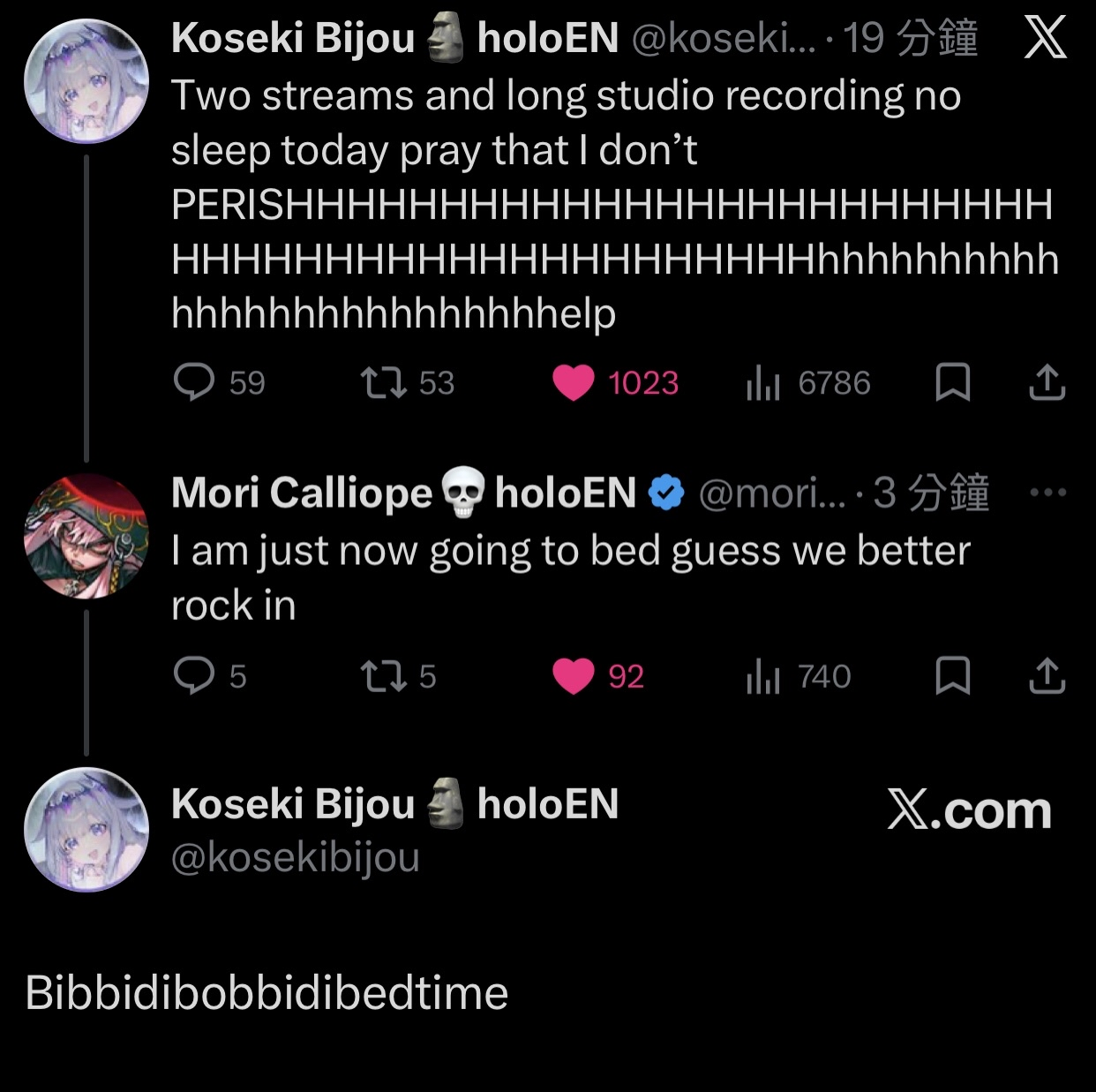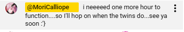 >>110175856Ur replying to the deathclockschizo anon, the same retard who spent like a saying she hates Mori so much doesn't even want to be the same room only for them to do an offcollab a few days