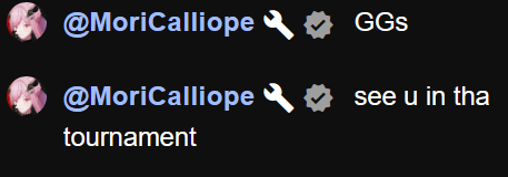 >>110257953She started a match against someone named "Mori" and was like "IS THAT YOU? I CAN'T TELL!" It was pretty funny.